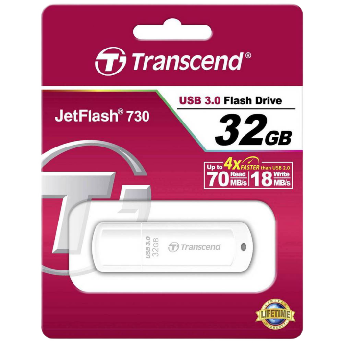 32GB USB3.1 Flash Drive Transcend "JetFlash 730", White, Classic (R/W:90/20MB/s)