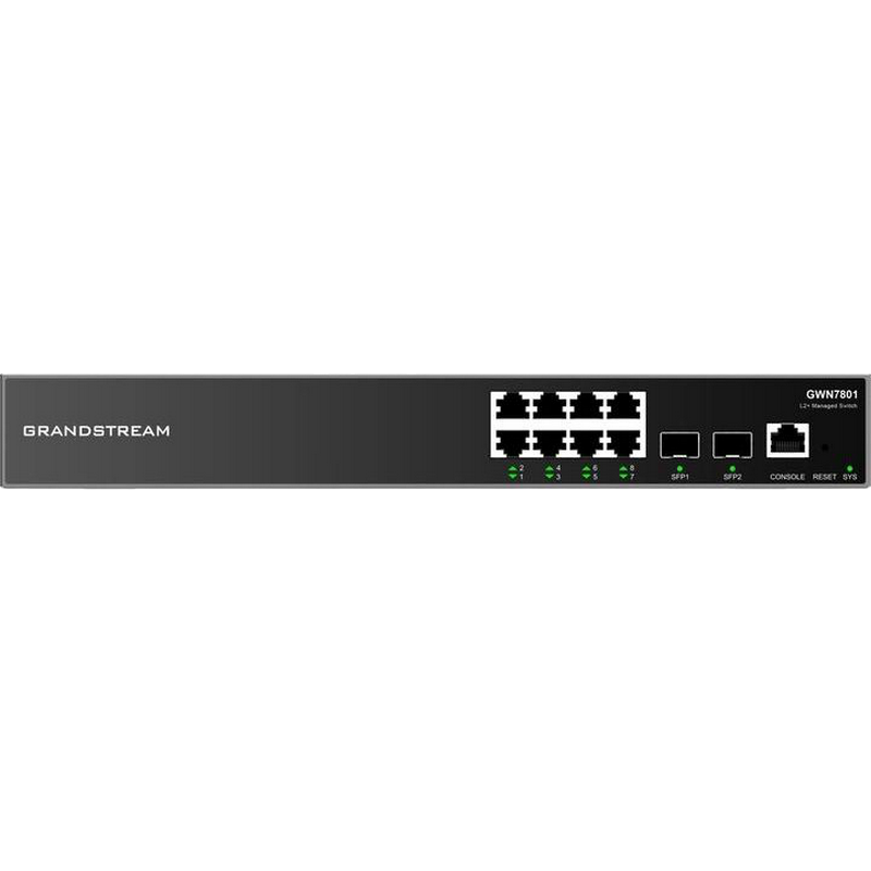 // 8 Gigabit Ethernet ports and 2 Gigabit SFP ports Supports deployment in IPv6 and IPv4 networks Provides quaternary binding of IP, MAC, VLAN & port; ARP Inspection, IP Source Guard, DoS protection, port security & DHCP snooping Local Web UI to manage switch; GWN.Cloud and GWN Manager, Grandstream’s cloud and on-premise Wi-Fi management platform Built-in QoS allows for prioritization of network traffic https://www.grandstream.com/products/networking-solutions/network-switches/product/gwn7800series
