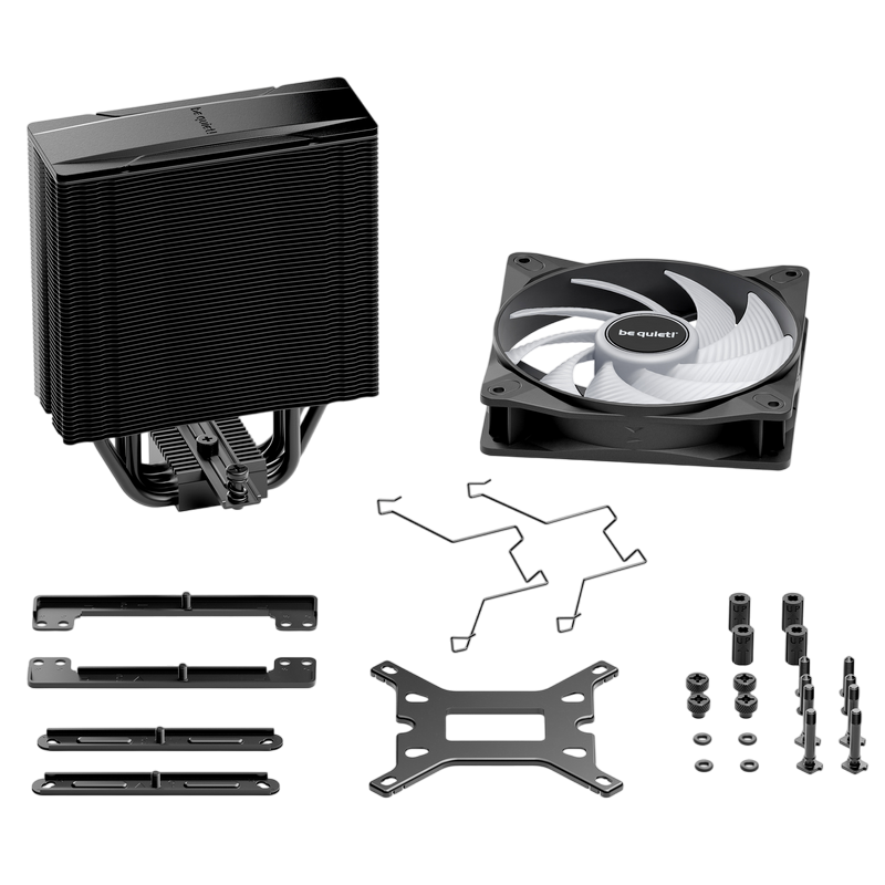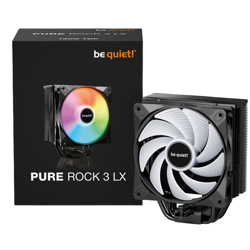 . 1851 / 1700 / 1200 / 1150 / 1151 / 1155 AM5 / AM4 Model Pure Rock 3 LX TDP (W) 190 Color option Black Overall dimensions without mounting material (L x W x H), (mm) 71 x 124 x 154 Total weight (kg) 0.57 Socket compatibility Intel 1851 / 1700 / 1200 / 1150 / 1151 / 1155 Socket compatibility AMD AM5 / AM4 Overall noise level (dB(A)) @ 50/75/100% (rpm) 12.4 / 24.4 / 31.2 Number of fans 1 Dimensions (L x W x H), (mm) 46 x 124 x 154 Fin material Aluminum Surface treatment Electrophoresis Base material Aluminum / Copper CPU contact surface Heat pipe direct touch Heatpipe number / Diameter (mm) 4 / 6 Fan specifications Fan model Light Wings LX 120mm PWM Fan dimensions (mm) 120 x 25 x 120 Speed @ 100% PWM (rpm) 2000 Airflow at 100% PWM / 12V (CFM / m3/h) 61.8 / 105.1 Air Pressure at 100% PWM / 12V (mm H2O) 2.51 Bearing technology Rifle Motor technology 4-pole fan motor Rated Voltage (V) 12 Input current (A) 0.15 Safety current (A) 0.30 Input power (W) 5.4 Connector 4-pin PWM Lighting connector ✓ Cable length (mm) 120 Lifespan (h / 25°C) 60,000