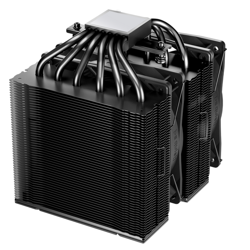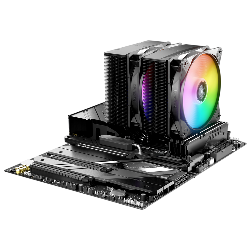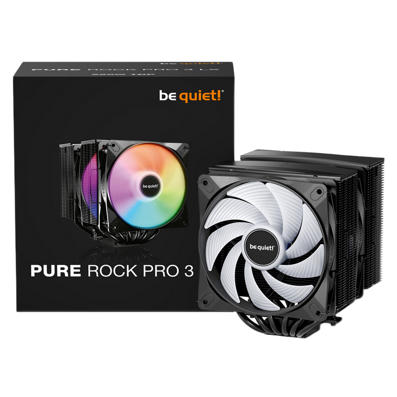 . Model Pure Rock Pro 3 LX TDP (W) 250 Color option Black Overall dimensions without mounting material (L x W x H), (mm) 139 x 124 x 155 Total weight (kg) 1.08 Socket compatibility Intel 1851 / 1700 / 1200 / 1150 / 1151 / 1155 Socket compatibility AMD AM5 / AM4 Overall noise level (dB(A)) @ 50/75/100% (rpm) 14.0 / 26.5 / 34.8 Number of fans 2 Dimensions (L x W x H), (mm) 114 x 124 x 155 Fin material Aluminum Surface treatment Electrophoresis Base material copper / nickel plated CPU contact surface CNC machined Heatpipe number / Diameter (mm) 6 / 6 Fan specifications Fan model Light Wings LX 120mm PWM Fan dimensions (mm) 120 Speed @ 100% PWM (rpm) 2000 Airflow at 100% PWM / 12V (CFM / m3/h) 61.8 / 105.1 Air Pressure at 100% PWM / 12V (mm H2O) 2.51 Bearing technology Rifle Motor technology 4-pole fan motor Rated Voltage (V) 12 Input current (A) 0.10 Safety current (A) 0.45 Input power (W) 5.4 Connector 4-pin PWM Lighting connector ✓ Cable length (mm) 120 Lifespan (h / 25°C) 60,000 Y-Cable ✓