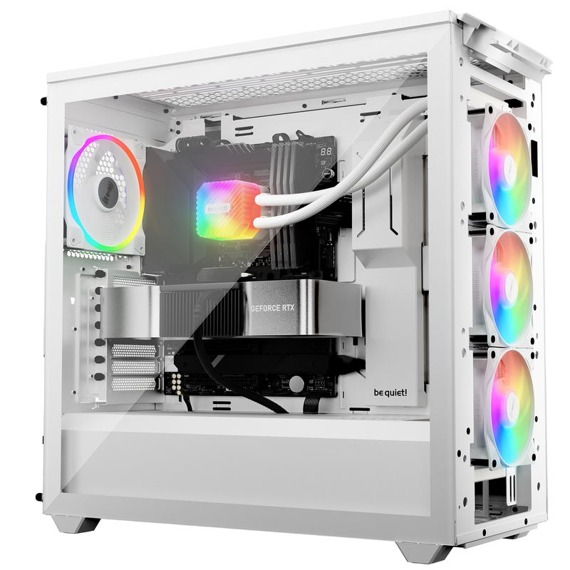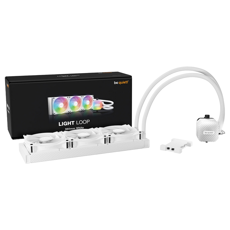 . Intel 1700 / 1200 / 1150 / 1151 / 1155 AMD AM5 / AM4 General data Model Light Loop 360mm Color option White Dimensions radiator, incl. fan (H x W x D), (mm) 397 x 120 x 52 Dimensions cooling block (H x W x D), (mm) 75 x 94 x 82 Total weight (kg) 1.48 Socket compatibility Intel 1700 / 1200 / 1150 / 1151 / 1155 Socket compatibility AMD AM5 / AM4 Noise level (dB(A)) at 50% / 75% /100% rpm 17.2 / 29.1 / 36.8 Number of fans 3 Lighting connector 3 Pin 5V Adressable Tube length (mm) 400 Refill port ✓ Infographics open all / close all Pump specifications Pump speed (rpm) 2900 Pump adjustable (rpm) 1500 - 2900 Pump connector 4-pin PWM Radiator specifications Dimensions (L x W x H), (mm) 397 x 120 x 27 Radiator material / finish aluminum / white spray painted Base material / finish copper / nickel plated Fan specifications Fan model Light Wings LX 120mm PWM high-speed Fan dimensions (mm) 120 x 120 x 25 Speed at 100% PWM (rpm) 2100 Airflow at 100% PWM / 12V (CFM / m3/h) 61.8 / 105.1 Air Pressure at 100% PWM / 12V (mm H2O) 2.51 Bearing technology Rifle Motor technology 4-pole fan motor Rated Voltage (V) 12 Input current (A) 0.17 Safety current (A) 0.45 Input power (W) 5.4 Connector 4-pin PWM Cable length (mm) 500 Lifespan (h / 25°C) 60,000 Accessories Thermal grease (Type) Included Mounting set Intel, AMD Bottle of coolant (ml) ✓/ 100 ARGB-PWM-Hub ✓ User manual languages CN, DE, EN, ES, FR, JP, PL, RU, TW, UA Safety certifications Approvals CE, FCC, UKCA Environmental directives RoHS ✓ WEEE ✓ Triman ✓ Service Warranty (Years) 3 International hotline / free of charge ✓/ DE, FR Logistics data and RRP Article number BW022 EAN code 4260052191132 Dimensions, package (L x W x H), (mm) 448 x 205 x 137 Gross weight, package (kg) 2.6 Pieces per packaging unit 4 Dimensions, shipping box (L x W x H), (mm) 470 x 300 x 460 Gross weight, shipping box (kg) 11.3