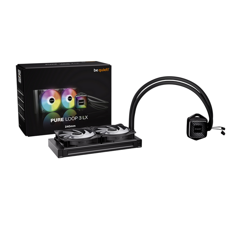 AIO Liquid Cooling be quiet! "Pure Loop 3 LX 240mm" (15.4-35.2dB, 2x120mm, PWM, 2100RPM, 61.8 CFM, Pump:5500RPM, ARGB 1050g.)