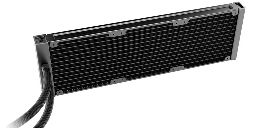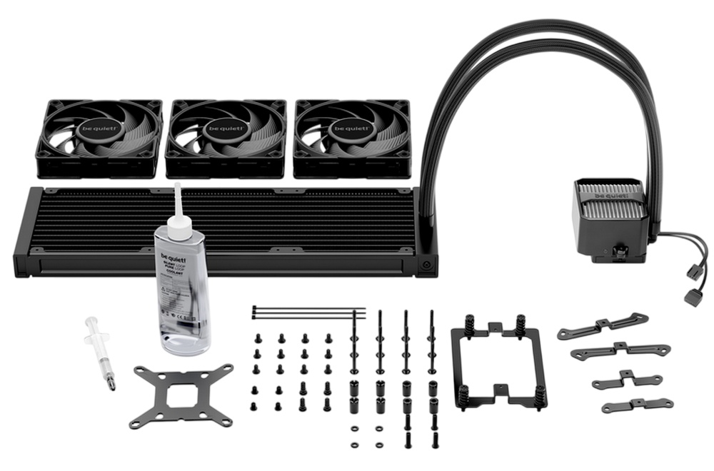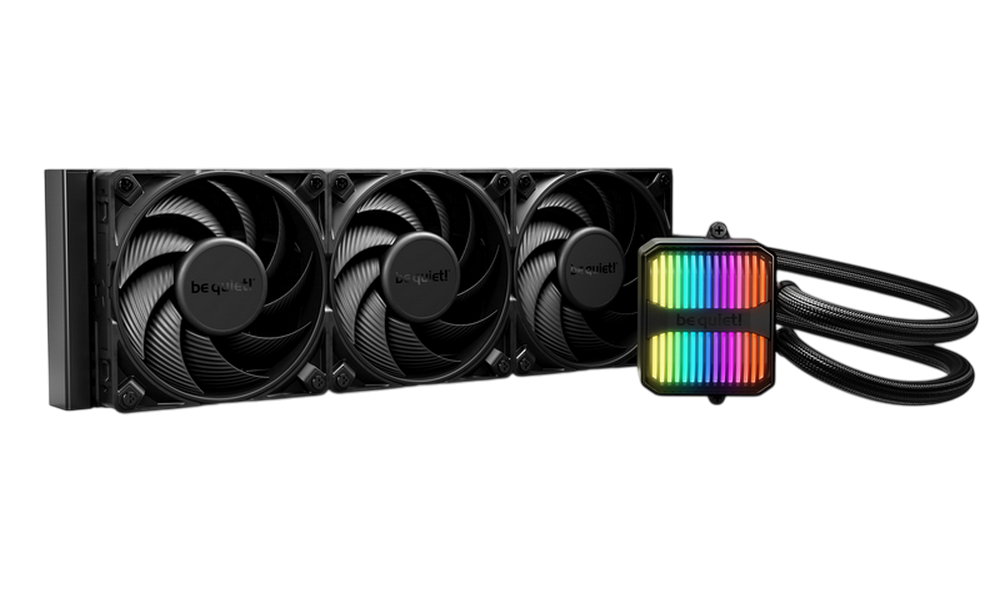 . 1851 / 1700 / 1200 / 1150 / 1151 / 1155 AM5 / AM4 / TR5 / TR4 Model Silent Loop 3 360mm Color option Black Dimensions radiator, incl. fan (H x W x D), (mm) 397 x 120 x 52 Dimensions cooling block (H x W x D), (mm) 93.5 x 80 x 56 Total weight (kg) 1.77 Socket compatibility Intel 1851 / 1700 / 1200 / 1150 / 1151 / 1155 Socket compatibility AMD AM5 / AM4 / TR5 / TR4 Noise level (dB(A)) at 50% / 75% /100% rpm 19.8 / 31.9 / 38.8 Number of fans 3 Lighting connector 3 Pin 5V Adressable Tube length (mm) 400 Refill port ✓ Pump speed (rpm) 3500 Pump adjustable (rpm) 1700 - 3500 Pump connector 4-pin PWM Radiator specifications Dimensions (L x W x H), (mm) 397 x 120 x 27 Radiator material / finish aluminum / black spray painted Base material / finish copper / nickel plating Fan model Silent Wings 4 120mm PWM Fan dimensions (mm) 120 x 120 x 25 Speed at 100% PWM (rpm) 2500 Airflow at 100% PWM / 12V (CFM / m3/h) 76,7 / 130.3 Air Pressure at 100% PWM / 12V (mm H2O) 3.96 Bearing technology FDB Motor technology 6-pole fan motor Rated Voltage (V) 12 Input current (A) 0.30 Safety current (A) 0.40 Input power (W) 3.6 Connector 4-pin PWM Cable length (mm) 500 Lifespan (h / 25°C) 300,000