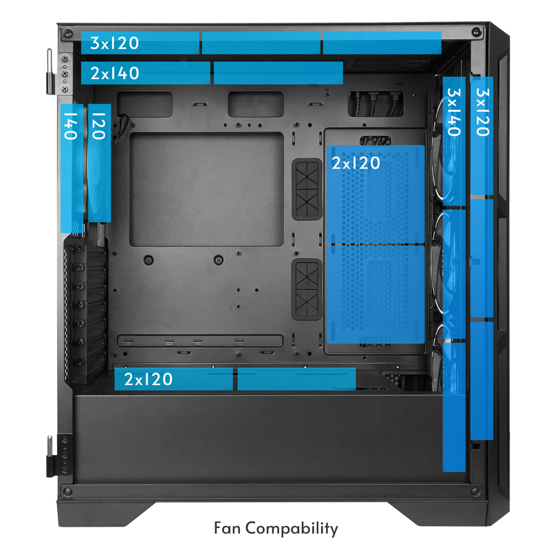 . PN: GA-01B-L-OP Model APEX Lumo Article no. GA-01B-L-OP EAN code 0753263078810 Color Black Material Material 0.6mm SPCC and tempered glass at left side panel Motherboard support Mini ITX, M-ATX, ATX, E-ATX Dimension (DxWxH) 465mm x 230mm x 495mm Weight (without/with package) 7.75 kg / 9.15 kg Drive bay external - Drive bay internal 3x 2.5“ and 1x 3.5“ / 2x 2.5“ and 2x 3.5“ Power supply ATX PSU (optional, ~220mm) Front I/O 1x USB3.2 Gen2 Type C, 2x USB3.0, Audio-out (AZALIA / HD-Audio), Mic-In, RGB Mode Button Scope of delivery Set of screws, instruction manual RGB control hub (DF-200) with 3PIN +5V M/B Sync and SATA power cable Front: 3x 140mm ARGB PWM fans pre-installed Rear: 1x 140mm ARGB PWM fan pre-installed Expansion slots 7 Cooling Compatibility Front: 3x 120mm / 3x 140mm / 240mm radiator / 280mm radiator / 360mm radiator / 420mm radiator Top: 3x 120mm / 2x 140mm / 240mm radiator / 280mm radiator / 360mm radiator Rear: 120mm / 140mm PSU Cover : 2 x 120mm Side : 2 x 120mm CPU cooler height (max.) 175mm VGA card length (max.) 400mm