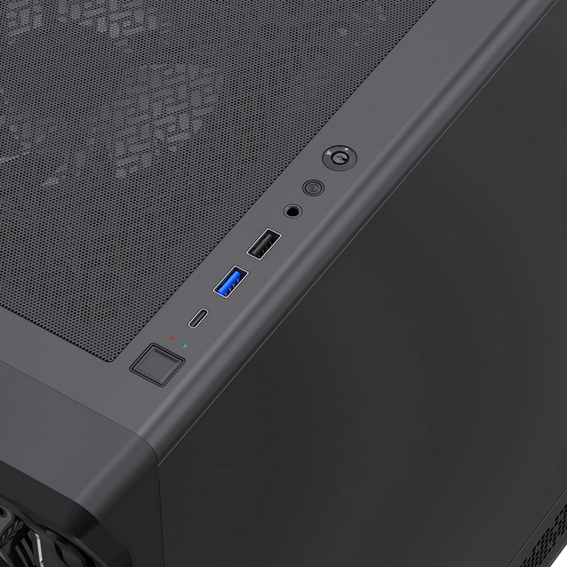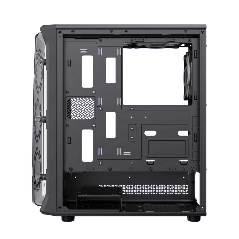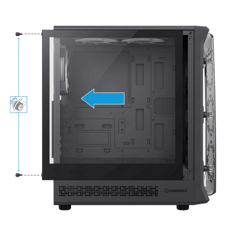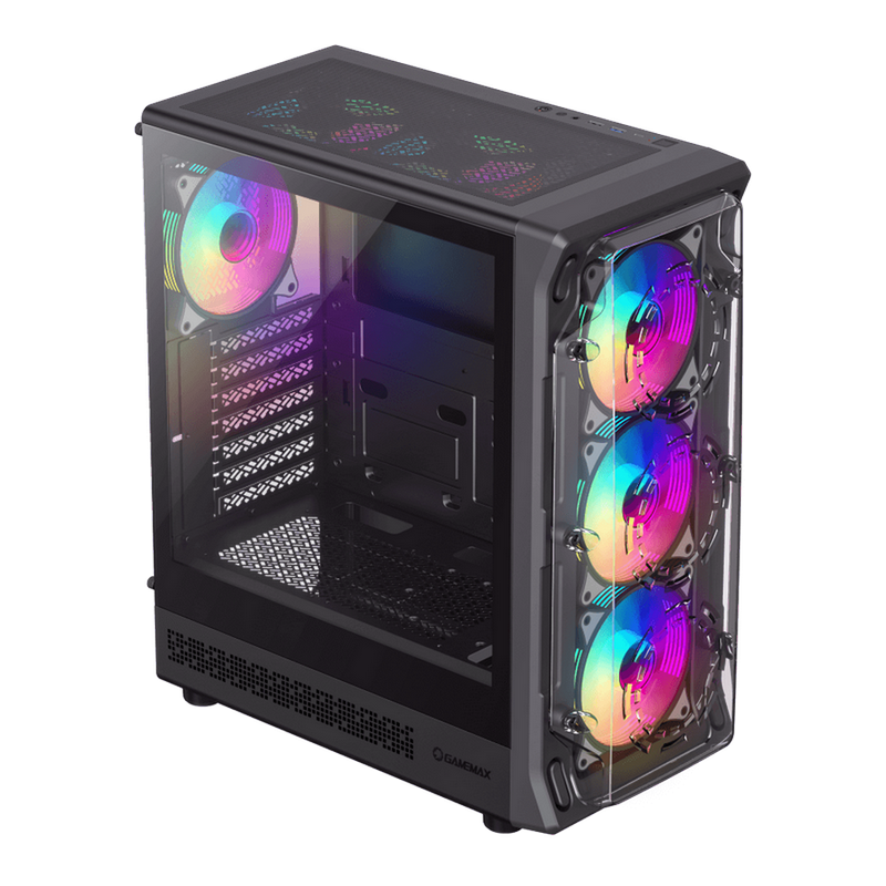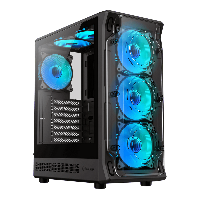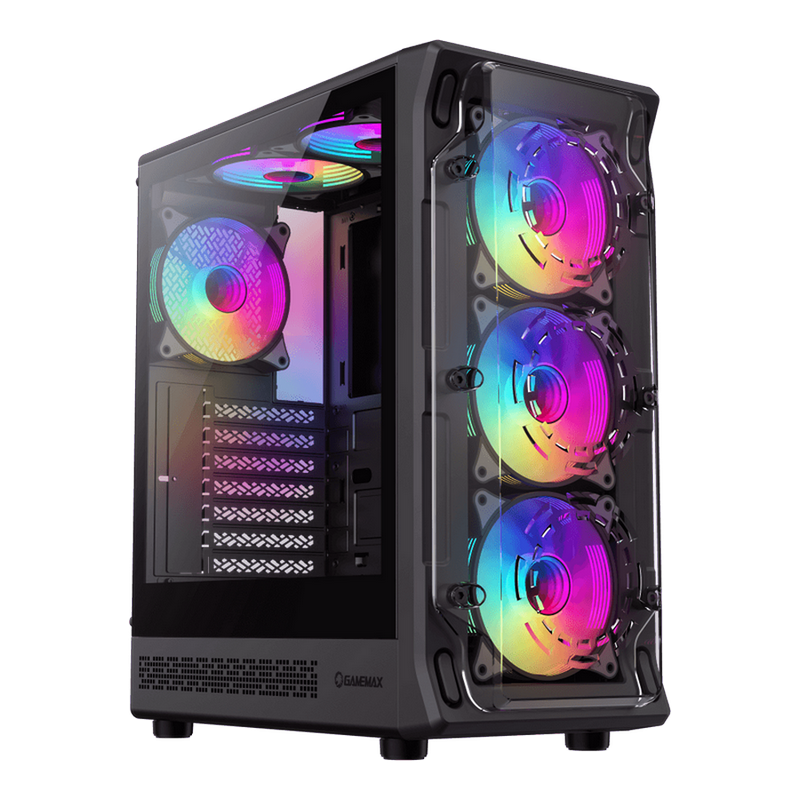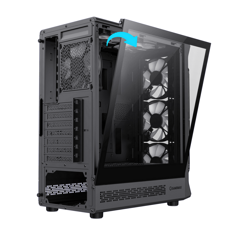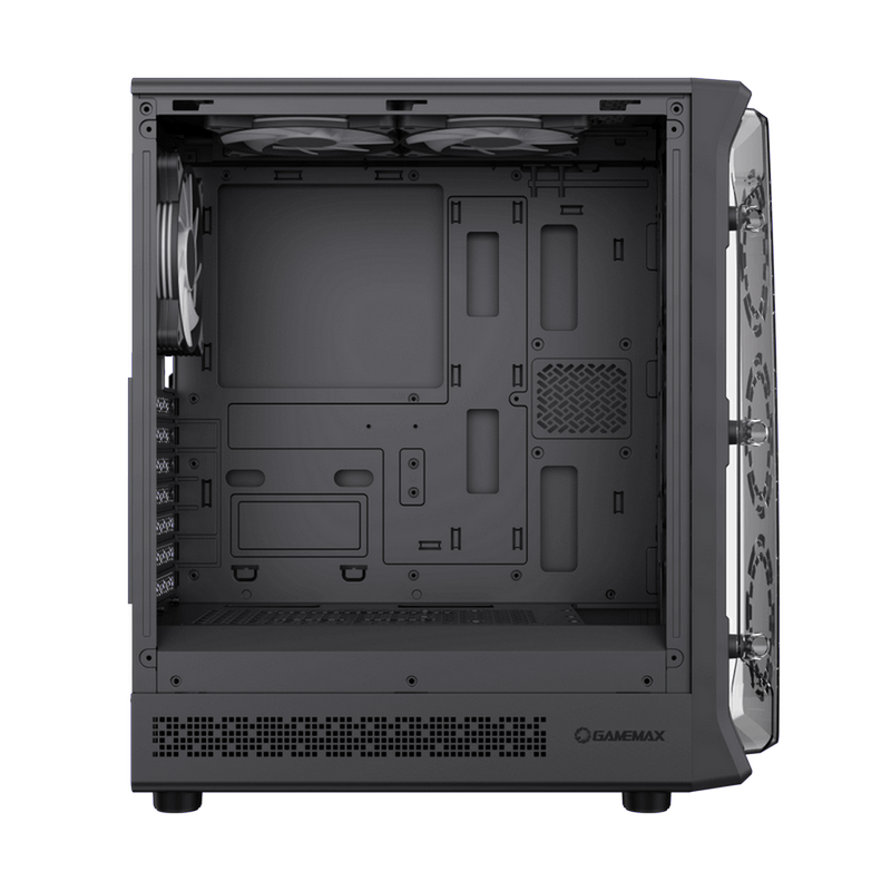 . Form Factor (Midi, Micro, Mini ITX, Full) Midi Tower Chassis SPCC: 0.4mm Chassis Black version PSU Form Factor Bottom/ATX M/B Form Factor EATX(280mm Max.),ATX,M-ATX,ITX Front Panel Acrylic panel Top Panel Metal cover Side Panel Left Tempered Glass Right Metal cover External Drive Bay(s) 5.25"(ODD) *0 3.5" *0 Internal Drive Bay(s) 3.5"(HDD) 1*3.5HDD+5*2.5SSD or 2*3.5HDD+3*2.5SSD or 3*3.5HDD+2*2.5SSD 2.5"(SSD) I/O Buttons *2 USB3.0 Port(s),USB2.0 Port *1x USB 3.0+1x USB 2.0 HD Audio Support Combo Audio(CTIA)*1 Type c *1(2.0 or GEN1 or GEN2) P-Lock *1 (optional) Controller max. fans *0 RGB Controller max. LED strips *0 Cooling Fan Support Front 3x120mm(Fan Included) ,2x140mm(Fan optional) Top 2x120mm(Fan Included) ,2x140mm(Fan optional) Rear 1x120mm (Fan Included) PSU Cover 2x120mm (Fan optional) Water Cooling Support Front 120mm, 140mm,240mm,280mm.360mm Top *0 Rear 120mm*1 Dust Cover Bottom and top cover with dust filter Slots *7 Carton Logo GAMEMAX Dimensions (L)340*(W)200*(H)436mm VGA Card Length up to 330mm CPU Cooler Height 155mm Cable Management Depth 19mm