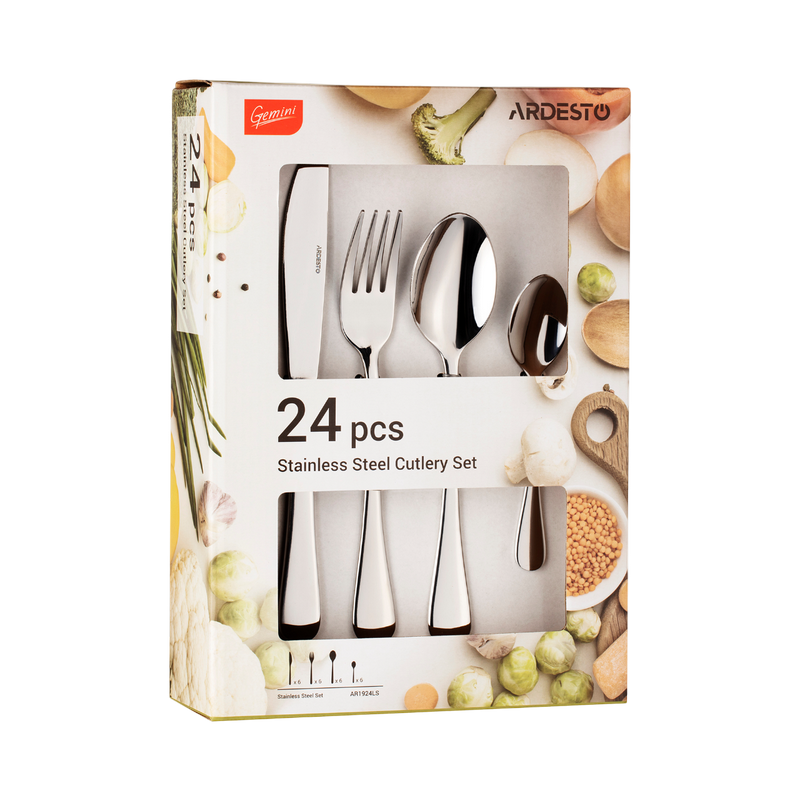Colectie: Materialul suprafeței de lucru: Oțel inoxidabil Numărul de piese în set: 24 Set: Cuțit de masă(230 mm), Furculiță de masă(199 mm), Lingură de masă(194 mm), Lingură de ceai(135 mm) Spălarea în mașina de spălat vase: Да