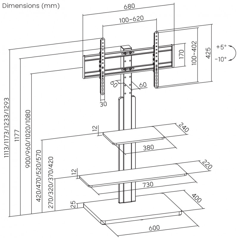 Dimensiune minimă Ecran: 32 " Dimensiune maximă Ecran: 75 " Greutate maximă de încărcare: 40 kg Interval de înclinare: +5°/-10° Compatibilitate cu suportul VESA: 100x100, 200x100, 200x200, 300x200, 300x300, 400x200, 400x300, 400x400, 600x400