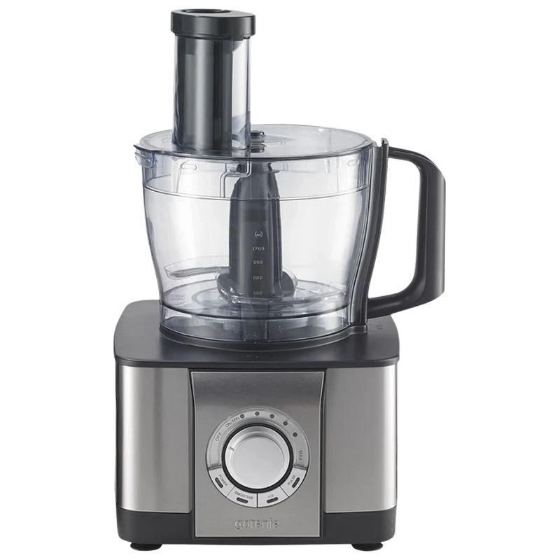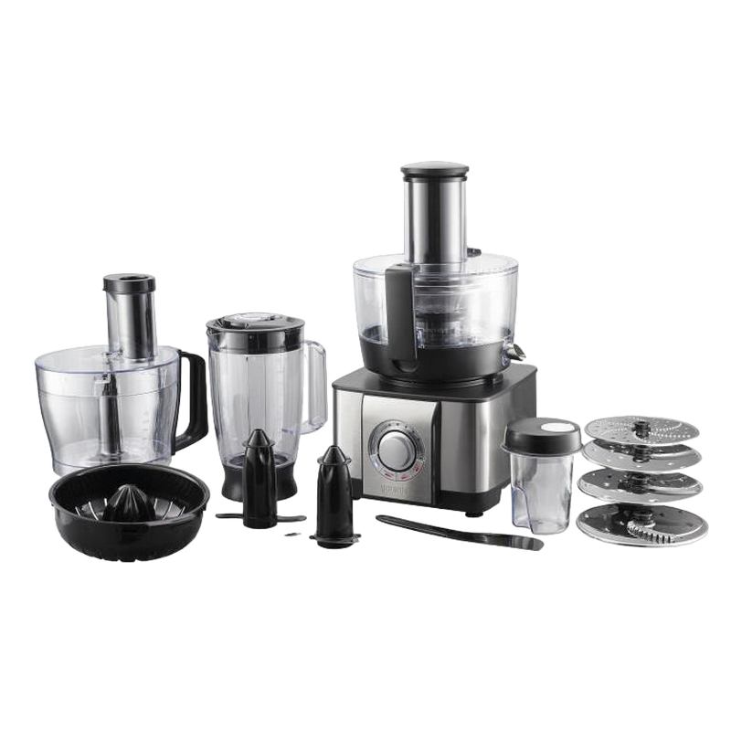 .1100W power output, bowl 2,4l, mixing bowl 1.5l, citrus reamer, coffee grinder, dough kneader, fine shredding disc, fine grating disc, spatula, grating disc, thin slicing disc, coarse shredding disc, thick slicing disc, stainless steel/black