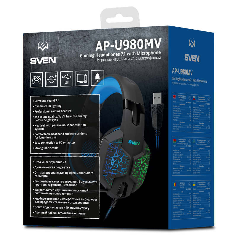 . Чувствительность наушников, дБ 108 ± 3 Чувствительность микрофона, дБ -58 ± 3 Частотный диапазон наушников, Гц 20 – 20 000 Частотный диапазон микрофона, Гц 30 – 16 000 Мембрана, мм Ø 50 Сопротивление, Ом 32 Тип разъема USB Длина кабеля, м 2,2 Вес, г 365 Объёмное звучание 7.1 Динамическая подсветка Оптимизированы для профессионального гейминга Наушники с пассивной системой шумоподавления Высочайшее качество звучания Тканевая оплетка кабеля, препятствующая спутыванию Комфортная посадка https://www.sven.fi/ru/catalog/gaming_headphone/ap-u980mv.htm?sphrase_id=2216389