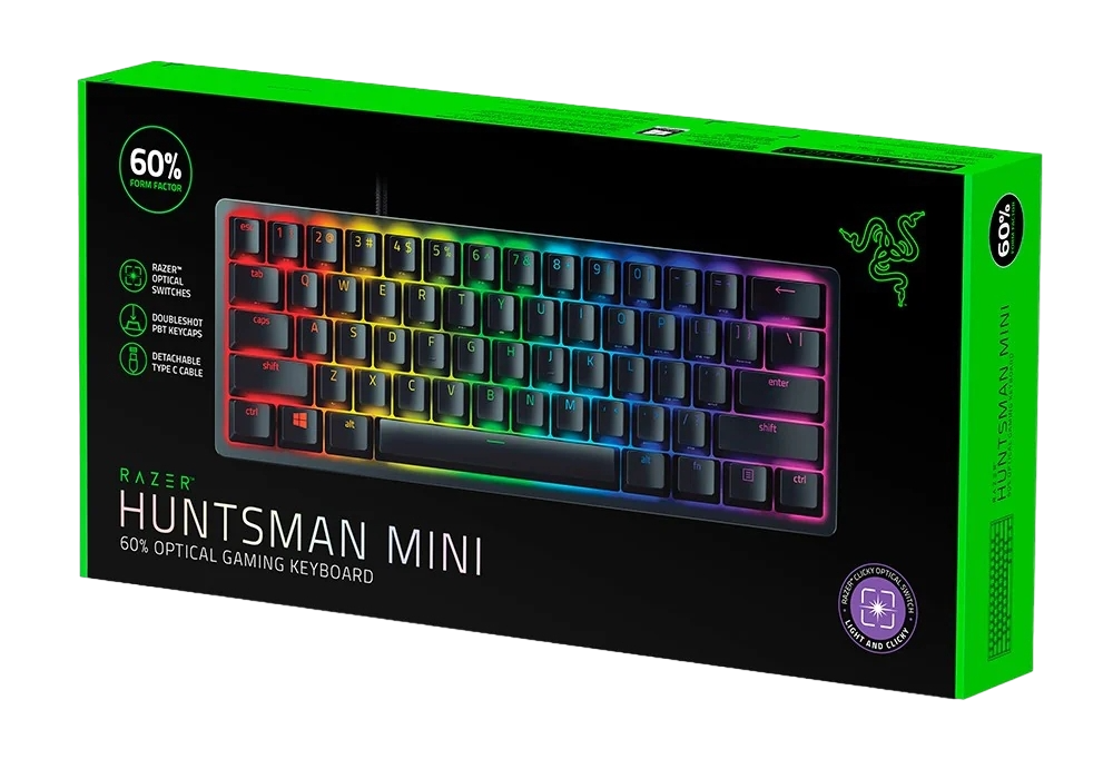 Gaming Keyboard Razer Huntsman Mini, Mechanical, 60% Form Factor, Optical Clicky SW, Aluminum, Doubleshot PBT Keycaps, Macro, RGB, USB, EN, Black