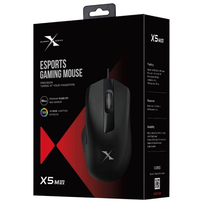 Gaming Mouse Bloody X5 Max, 50-10000 dpi, 5 buttons, 250IPS, 35G, Ergonomic, Rubber Grips, UV surface, LOD, P-CPI, R-Hz, D-CPI, RGB, 1.8m, USB, Black