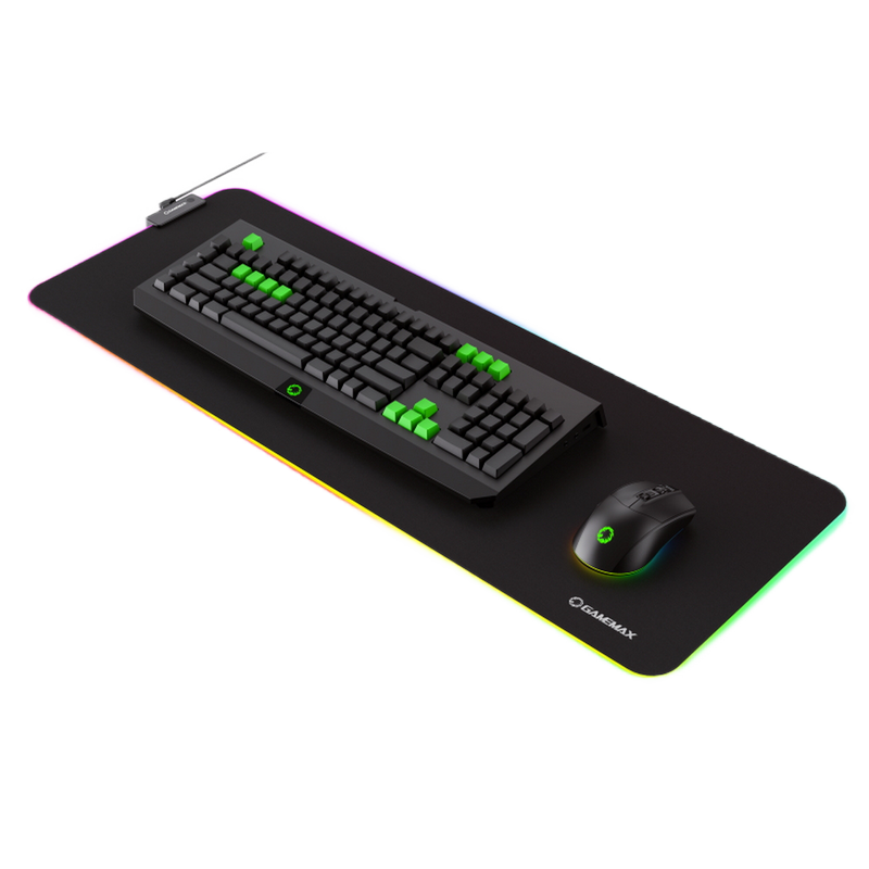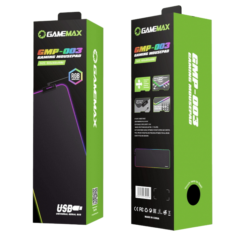 -- https://gamemaxpc.com/productkkk/1164-en.html Model Number GMP-003 Style RGB Gaming Mouse Pad Optimized for Gamers Color Black Material Rubber + Fabric Surface and Slippery Smooth Compatibility All Mice and Keyboards Dimensions 800*300*4mm Water Resistant Yes Lighting Mode 14 Different Lighting Cable Length 1.8M Cable Interface USB2.0 Software No