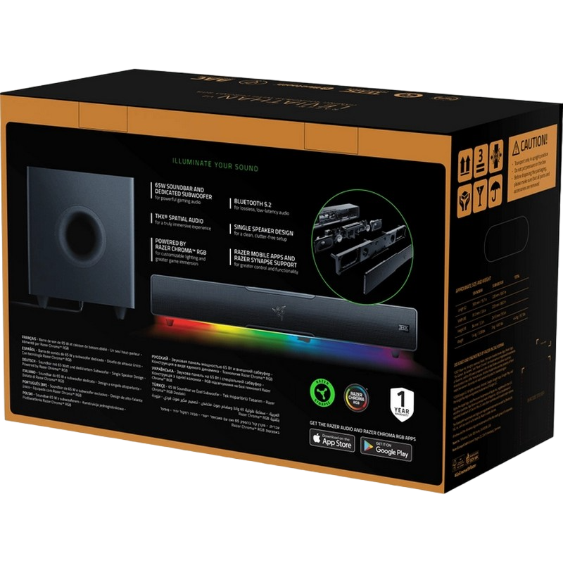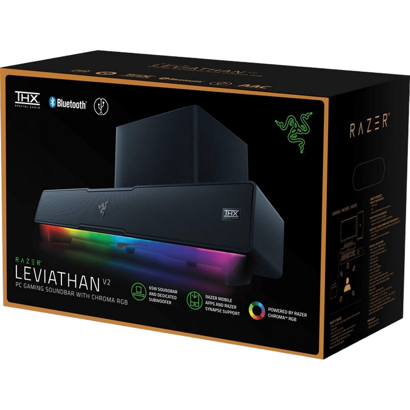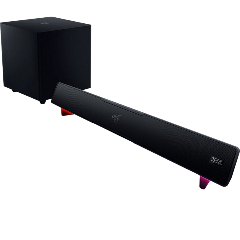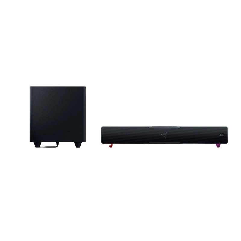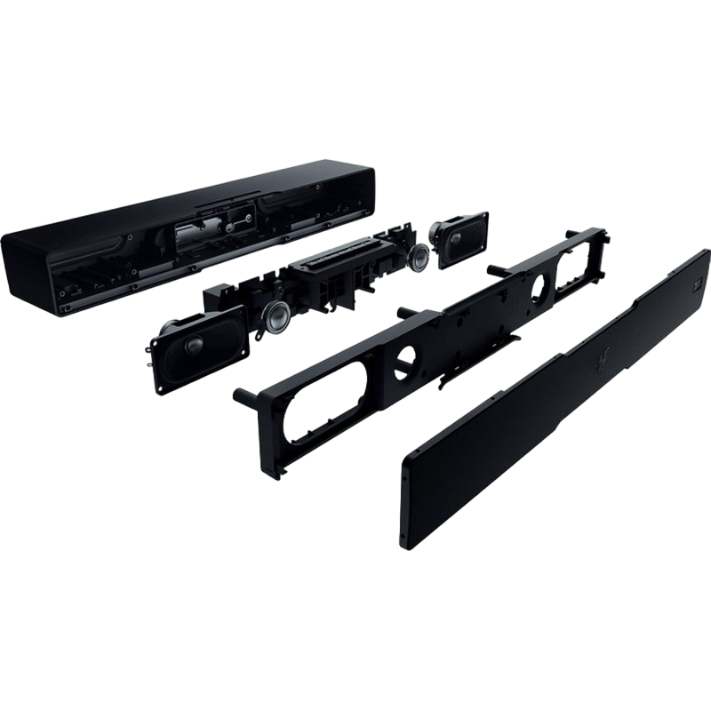 . PN: RZ05-02450100-R3G1 FREQUENCY RESPONSE 45 Hz – 20 kHz INPUT POWER External Power Adapter DRIVER SIZE - DIAMETERS (MM) Full Range Drivers: 2 x 2.0 x 4.0" / 48 x 95 mm Tweeter Drivers: 2 x 0.75" / 20 mm Passive Radiator Drivers: 2 x 1.7 x 5.3" / 43 x 135 mm Down-Firing Subwoofer: 1 x 5.5" / 140 mm DRIVER TYPE Full range drivers, tweeters drivers, passive radiator, and subwoofer driver See lessexpand_less APPROXIMATE WEIGHT Soundbar: 1.4 kg / 3.08 lbs Subwoofer: 3.0 kg / 6.61 lbs COMPATIBILITY Bluetooth 5.2 (60ms low latency) USB Audio Input to PC OTHERS Razer Chroma™ RGB (18 zones) THX Spatial Audio (PC based via Synapse 3) Bluetooth 5.2 (60ms low latency) USB audio input Razer Audio app Razer Chroma RGB app Custom 10-band EQ Raised feet on soundbar Headphone quick toggle Dimensions: Soundbar: 19.7 x 3.6 x 3.3" / 500 x 91.3 x 84 mm Subwoofer: 8.67 x 8.67 x 9.5" / 220 x 220 x 241.5 mm