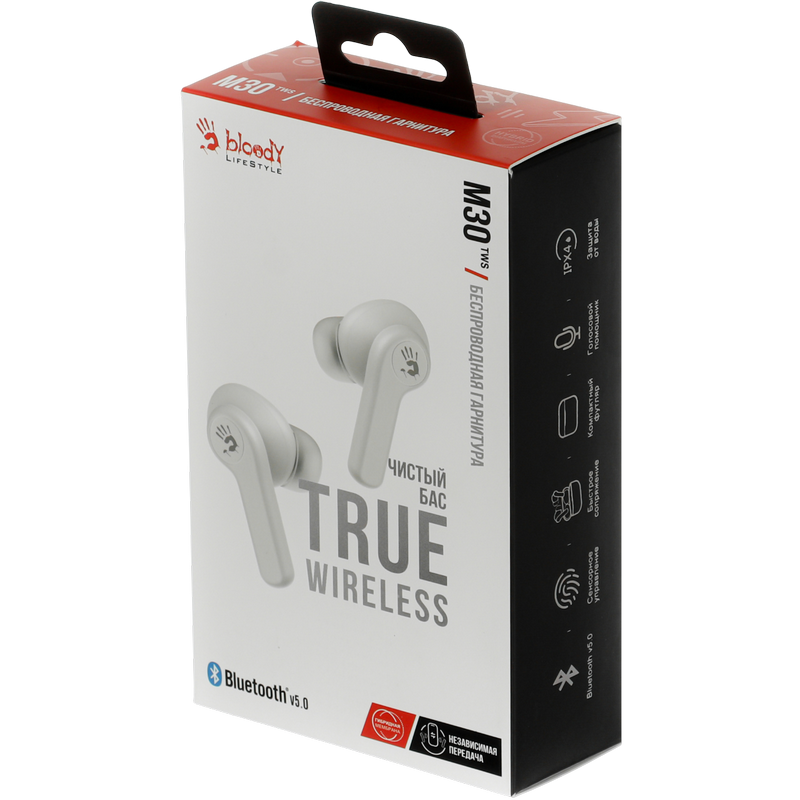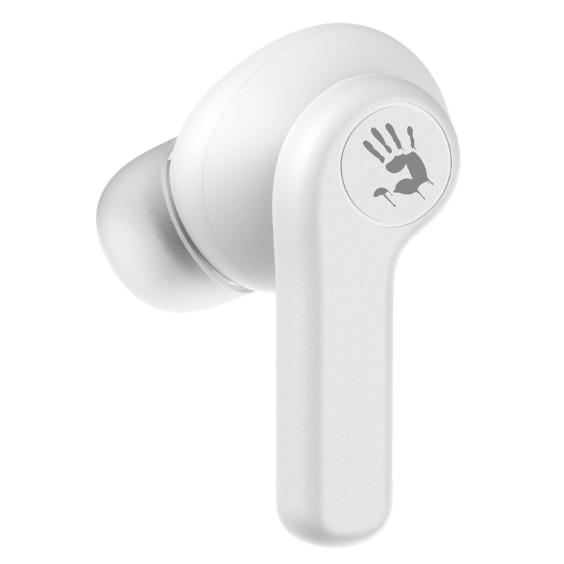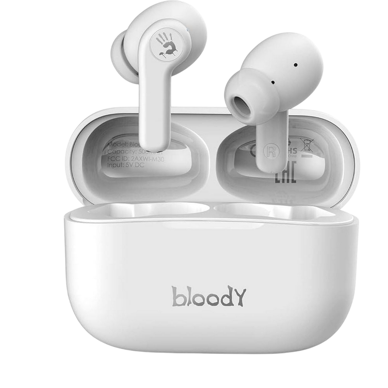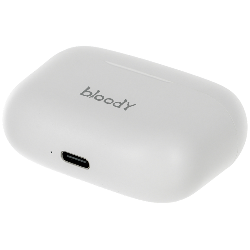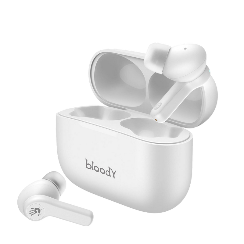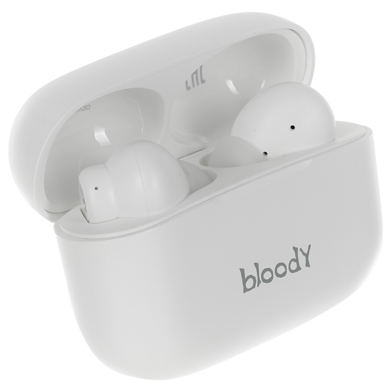 , Фирменный звук Bloody обеспечивает четкие высокие и средние частоты с глубокими басами. Bluetooth v5.0 улучшает стабильность беспроводного соединения для более плавной синхронизации аудио и видео. M.O.C.I. (Mycelium of Carbon IT) - мембрана изготовлена из наномицелия и углеродного волокна с использованием передовых технологий. Обеспечивает кристально четкие высокие и средние частоты, помогая раскрыть мельчайшие нюансы и глубину музыки. На одной зарядке гарнитура работает в режиме воспроизведения музыки до 4 часов. Еще до 18 часов работы обеспечивает подзарядка гарнитуры в алюминиевом зарядном футляре. Наушники работают независимо друг от друга и одновременно передают звук без задержек. Можно принимать вызовы используя один или оба наушника, что позволяет чередовать их подзарядку. Интуитивно понятное сенсорное управление: воспроизведение предыдущего / следующего трека, прием / завершение вызова, активация голосового помощника (например, Siri). Идеально подходят для тех, кто ведет активный образ жизни. Вы можете тренироваться под свои любимые мелодии. Автоматическое сопряжение после первого подключения при извлечении наушников из зарядного футляра. Будьте на шаг впереди используя преимущества голосовых помощников (Google Assistant, Amazon Alexa, Siri). Размер динамика 10 мм Частотный диапазон 20 Гц-20 кГц Чувствительность наушников 105 дБ при -10 дБ Чувствительность микрофона -42 дБ Импеданс 32 Ом Версия Bluetooth v5.0 Рабочее расстояние до 10 м Тип батареи наушников литиевая батарея (40 мАч) Тип батареи зарядного футляра литиевая батарея (500 мАч) Мощность 5 В = 500 мА Время зарядки наушников < 1,5 ч (от низкого заряда аккумулятора до полной зарядки) Время зарядки футляра <1,5 ч (от низкого заряда аккумулятора до полной зарядки) Время воспроизведения музыки с одной зарядкой ≈4 ч Время воспроизведения от зарядного устройства ≈22 ч Вес 37 г