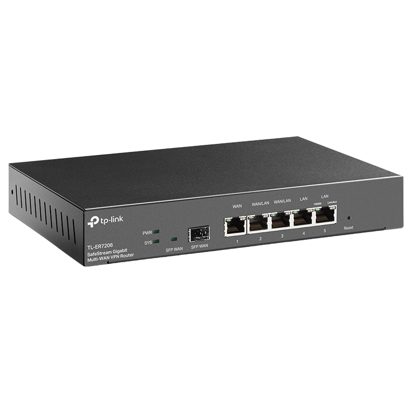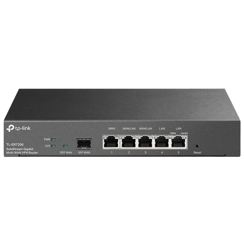 // Integrated into Omada SDN: Zero-Touch Provisioning (ZTP)**, Centralized Cloud Management, and Intelligent Monitoring. Centralized Management: Cloud access and Omada app for ultra convenience and easy management. Gigabit Ports: 1 gigabit SFP and 5 gigabit RJ45 ports provide high-speed wired connectivity. Up to 4 WAN Ports: 1 gigabit SFP WAN port, 1 gigabit RJ45 WAN port, 2 gigabit WAN/LAN ports optimize bandwidth usage. Highly Secure VPN: Supports up to 100× LAN-to-LAN IPsec, 50× OpenVPN*, 50× L2TP, and 50× PPTP VPN connections. Abundant Security Features: Advanced firewall policies, DoS defense,IP/MAC/URL filtering, and more security functions protect your network and data.
