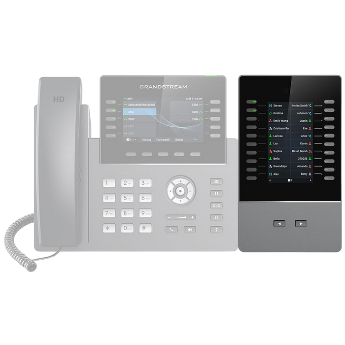 // supported by the GRP2615, GRP2624, GRP2650, GRP2670 4.3 inch (272x480) TFT color LCD 20 per page (each module contains 2 pages, for up to 40 lines per module) Combine up 4 daisy-chained modules for 160 contacts/extensions BLF, call park /pick-up, speed-dial, presence, intercom, voice conferencing transfer/forward and more https://www.grandstream.com/products/ip-voice-telephony/extension-modules/product/gbx20-extension-module