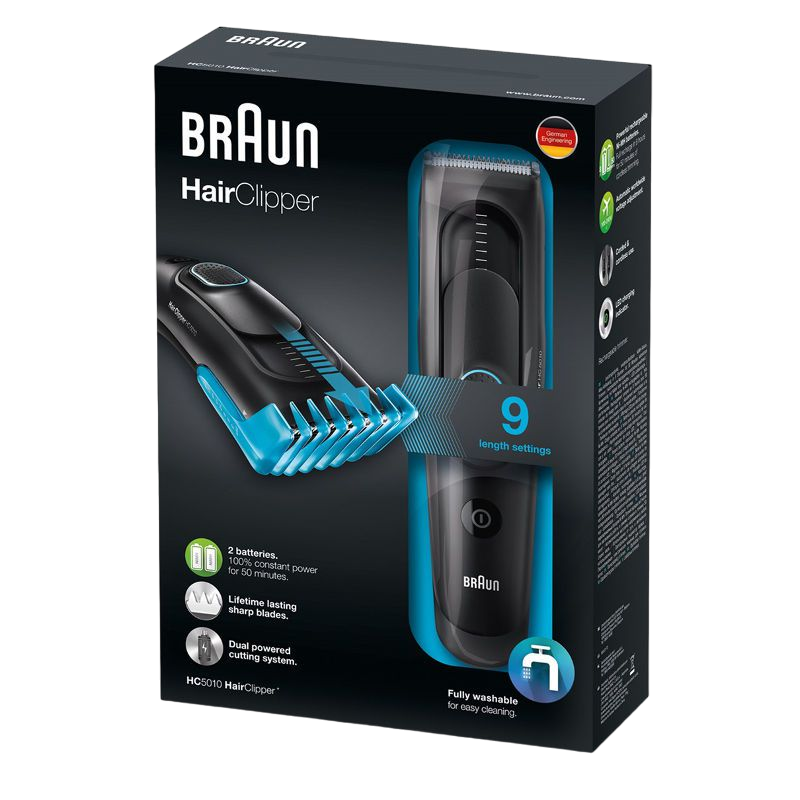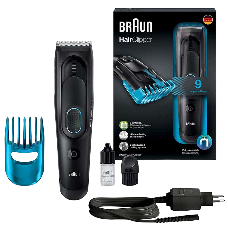 . Mains operation/rechargeable battery operation (operating time 50 minutes, charging time 8 hour). 8 cutting lengths (3-24mm), 1x comb, cleaning brush, oil, washable, automatic voltage adjustment 110-230V, charge level indicator, black