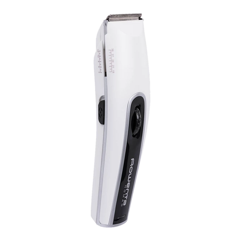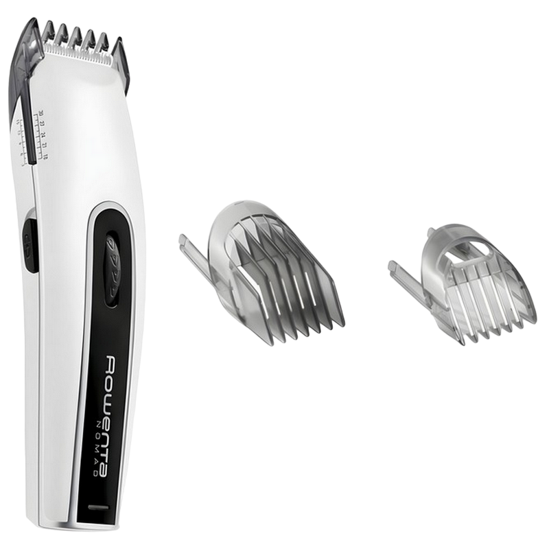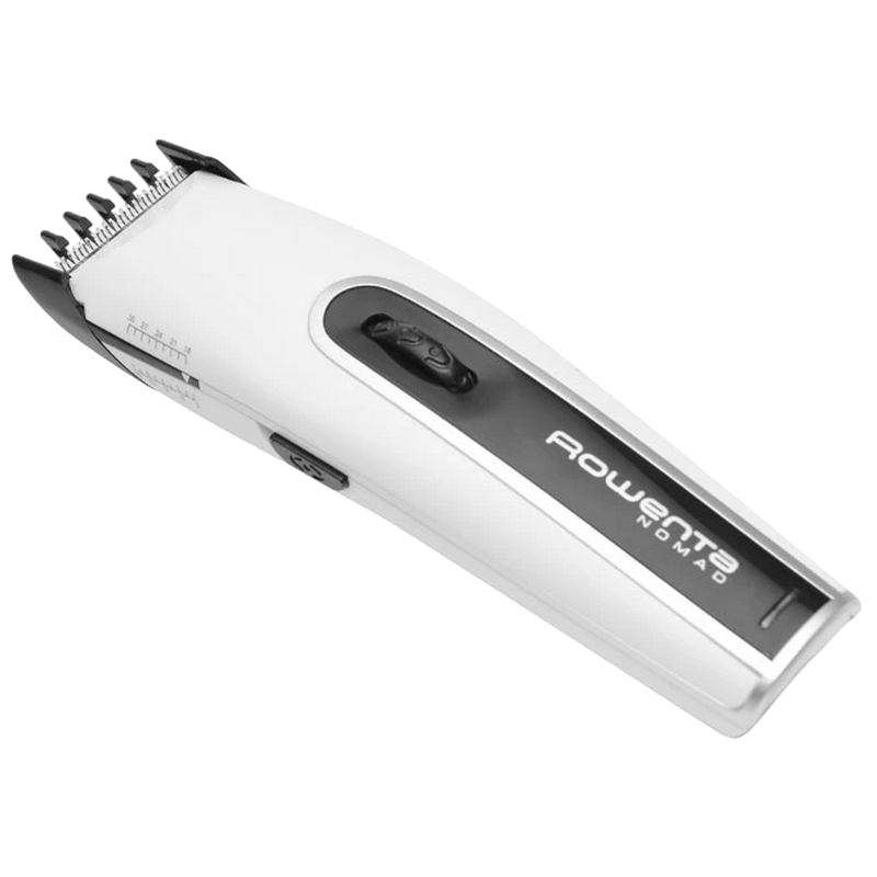 . Mains operation/rechargeable battery operation (operating time 40 minutes, charging time 8 hour), 19 cutting lengths (1-30mm), cutting width 41mm, 2 comb attachment, white
