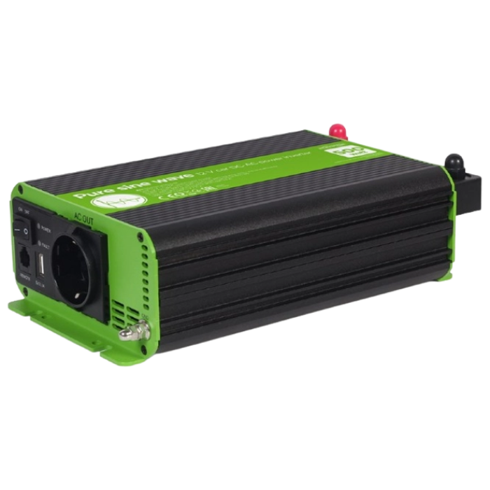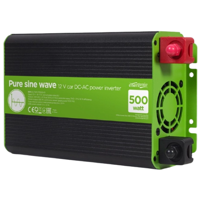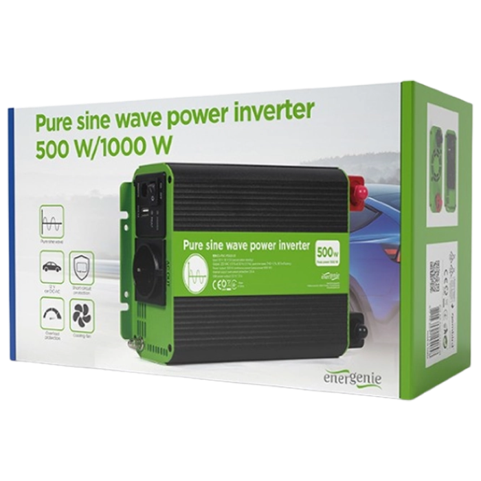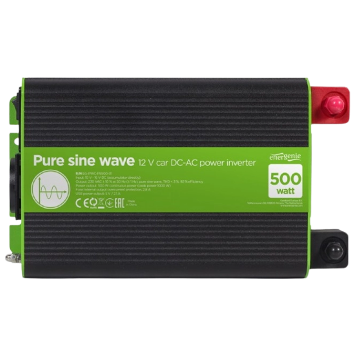 Inverter Energenie car power: Max.500W, 12 V, Input: 10-16 VDC (accumulator directly), Pure sine wave, 1xUSB-A, 1xSchuko Socket