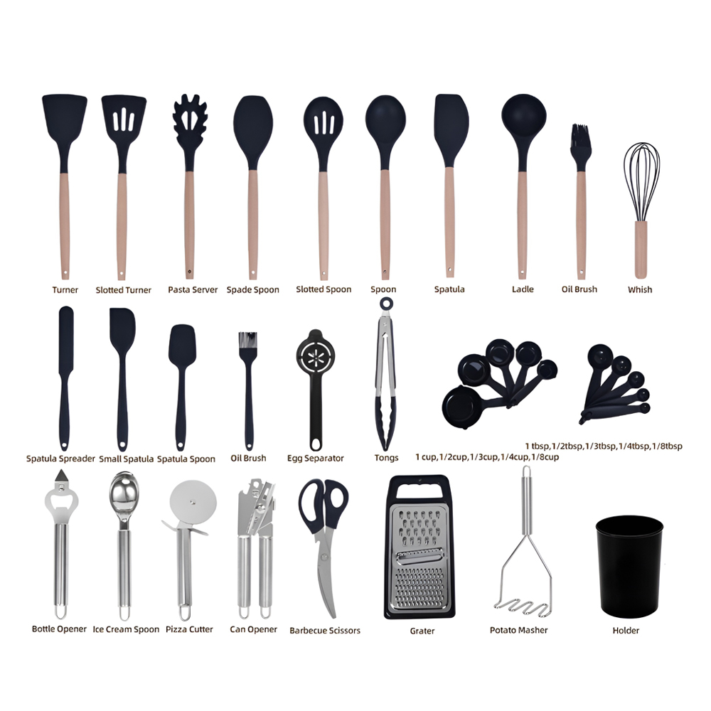 Setul include ustensile variate, precum linguri si spatule de diferite dimensiuni, tel, clesti, polonic, perie de curatare, accesorii pentru servire si multe altele, astfel incat sa acopere toate nevoile din timpul pregatirii meselor. Avand la dispozitie 44 de piese, fiecare sarcina culinara devine mai simpla si mai placuta.