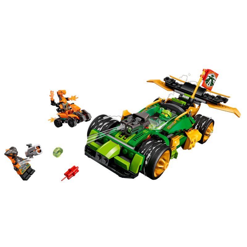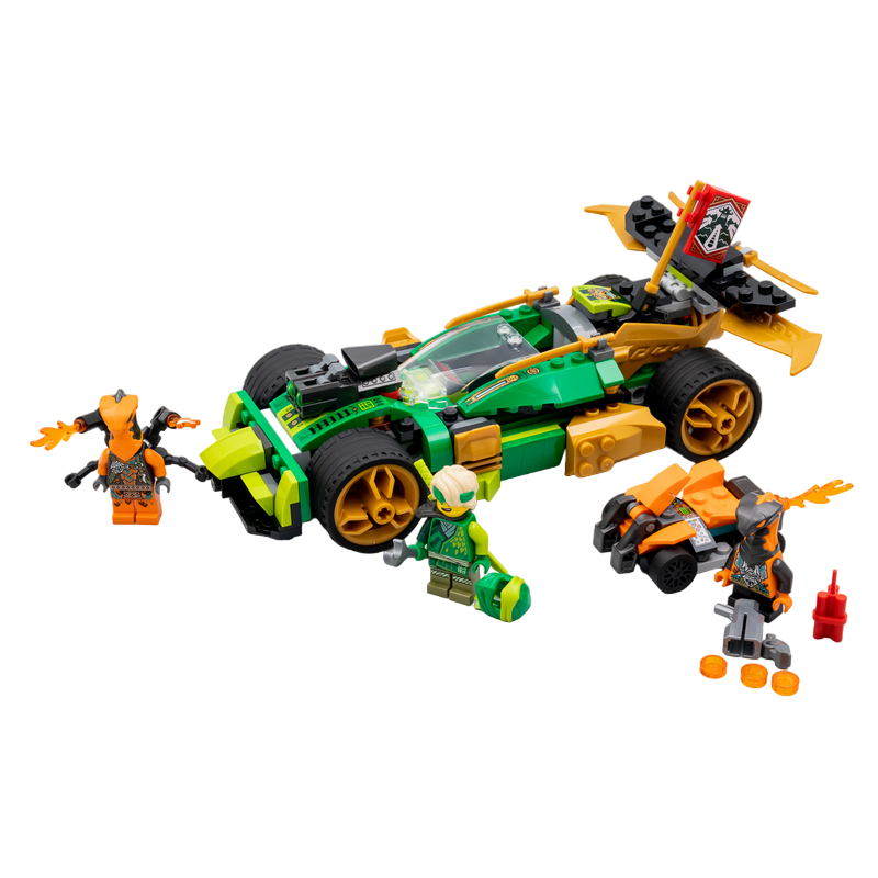„Mașina de curse a lui Lloyd’s EVO” Setul include 3 minifigurine Mașina de jucărie se transformă dintr-un buggy într-un vehicul mai puternic și mai rapid, cu armură, panouri laterale aurii, 2 trăgători și un spoiler cu lame Vârsta recomandată: 6+ Număr de piese: 279 Piese