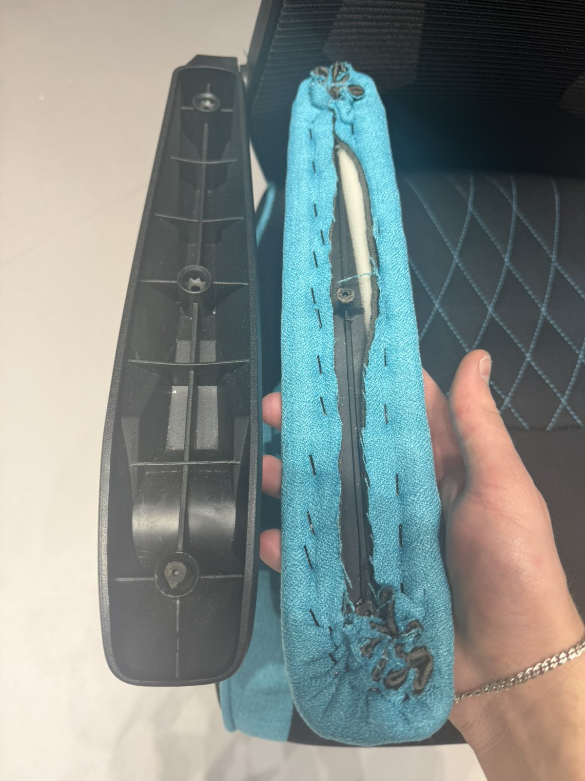 Cotiera scaunului este deteriorata,sunt prezente zgarieturi Materialul scaunului: Textil