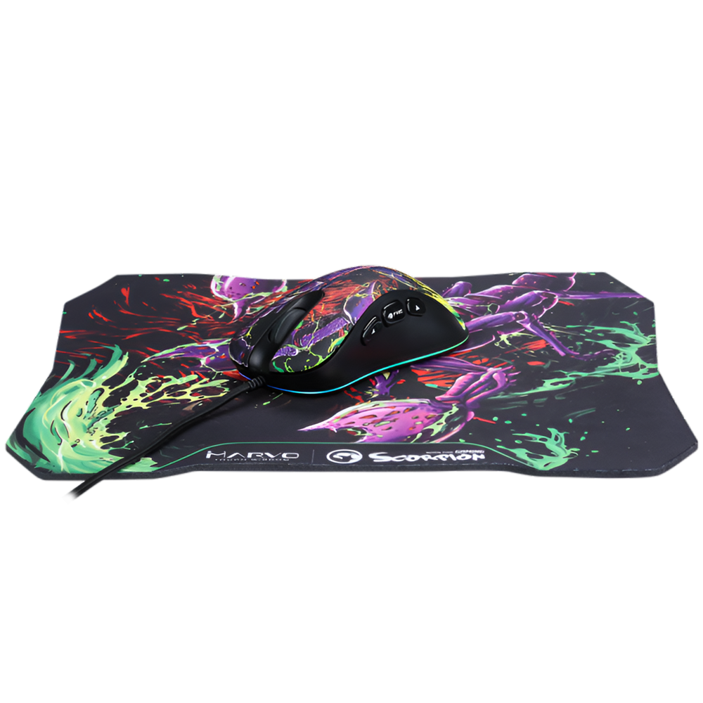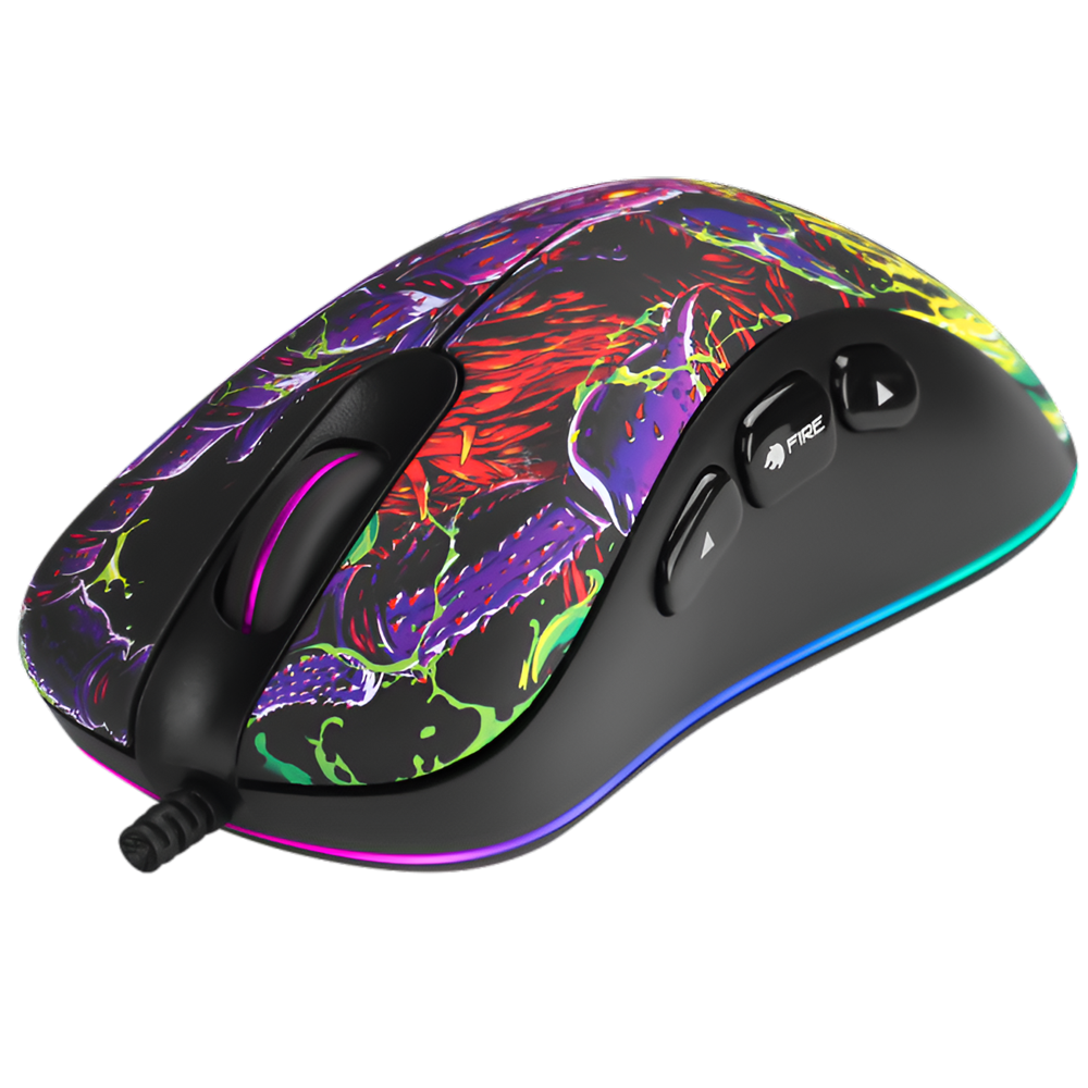 Un punct forte al mouse-ului este designul sau unic, “Acid Scorpion”, care adauga un aspect vizual agresiv si distinctiv. Iluminarea RGB integrata accentueaza acest design spectaculos, oferind efecte vizuale dinamice, perfecte pentru un setup de gaming vibrant.