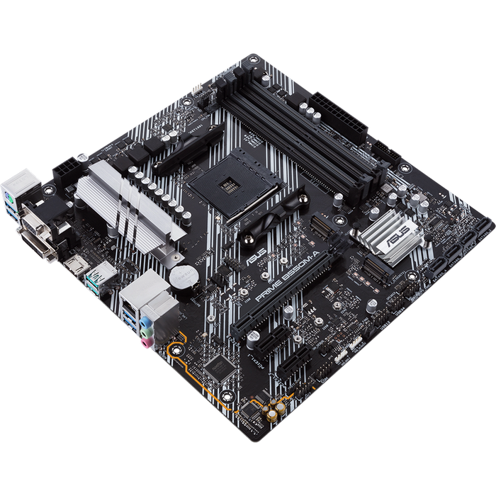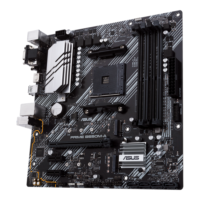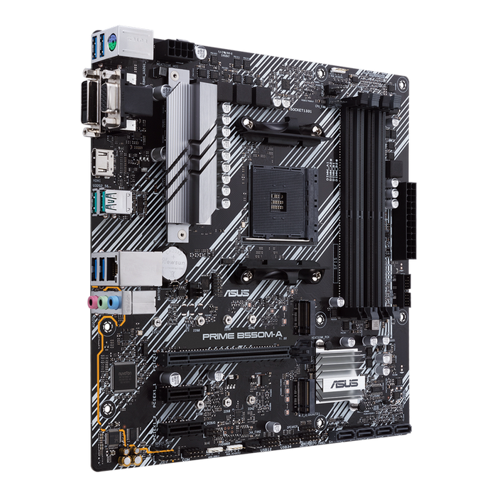 // CPU AMD AM4 socket: Ready for Ryzen™ 5000 Series/ 4000 G-Series/ 3000 Series Desktop Processors Chipset AMD B550 Memory 4 x DIMM, Max. 128GB, DDR4 4600(O.C)/4400(O.C)/4266(O.C.)/4133(O.C.)/4000(O.C.)/3866(O.C.)/3733(O.C.)/3600(O.C.)/3466(O.C.)/3333(O.C.)/3200/3000/2800/2666/2400/2133 MHz Un-buffered Memory * Dual Channel Memory Architecture Graphic 1 x D-Sub 1 x DVI-D 1 x HDMI 2.1(4K@60HZ) Expansion Slots 1 x PCIe 4.0 x16 (x16 mode) 2 x PCIe 3.0 x1 Storage 1 x M.2 Socket 3, with M Key, Type 2242/2260/2280/22110(PCIE 4.0 x4 and SATA modes) storage devices support 1 x M.2 Socket 3, with M Key, Type 2242/2260/2280 (PCIE 3.0 x4 and SATA modes) storage devices support 4 x SATA 6Gb/s port(s), Support Raid 0, 1, 10 LAN Realtek® RTL8111H Audio Realtek ALC887 7.1-Channel High Definition Audio CODEC USB Ports Rear USB Port ( Total 6 ) 2 x USB 3.2 Gen 2 port(s)(2 x Type-A) 4 x USB 3.2 Gen 1 port(s)(4 x Type-A) Front USB Port ( Total 6 ) 2 x USB 3.2 Gen 1 port(s)(2 x Type-A) 4 x USB 2.0 port(s)(4 x Type-A) https://www.asus.com/Motherboards-Components/Motherboards/PRIME/PRIME-B550M-A