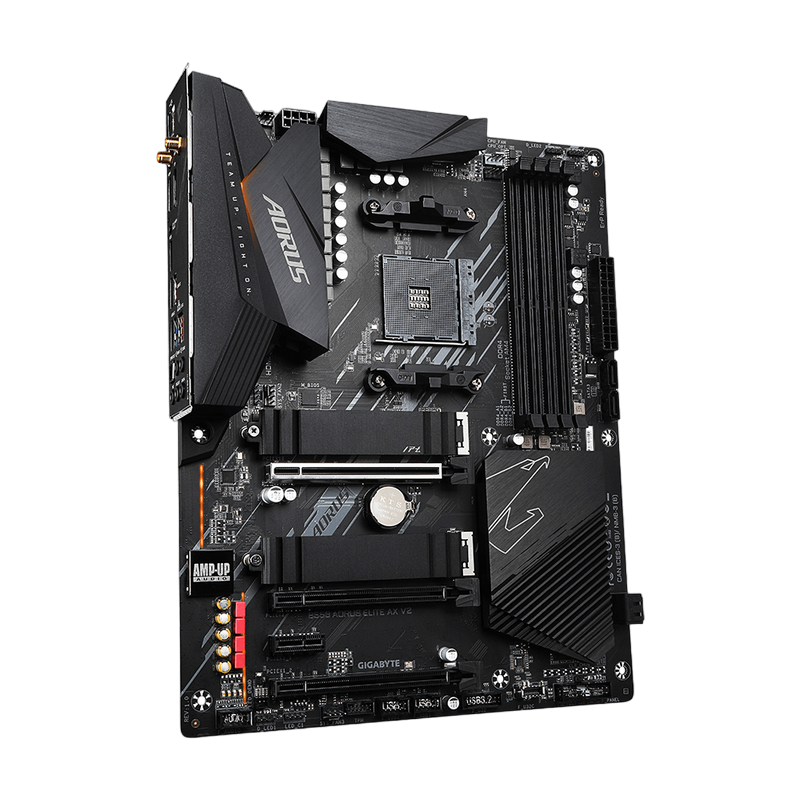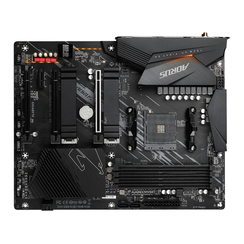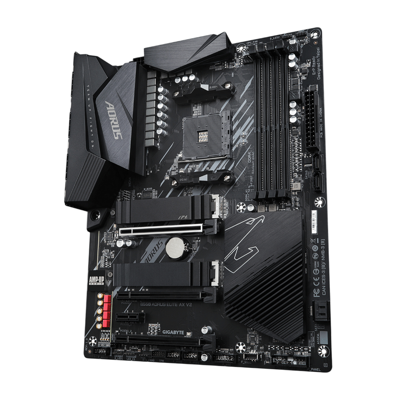 // CPU AMD Socket AM4, support for: 3rd Generation AMD Ryzen™ processors/ 3rd Generation AMD Ryzen™ with Radeon™ Graphics processors Chipset AMD B550 Memory 4 x DDR4 DIMM sockets supporting up to 128 GB (32 GB single DIMM capacity) of system memory Support for DDR4 4733(O.C.) / 4600(O.C.) / 4400(O.C.) / 4000(O.C.) / 3600(O.C.) / 3333(O.C.) /3200/2933/2667/2400/2133 MHz memory modules Dual channel memory architecture Onboard Graphics Integrated in the 3rd Generation AMD Ryzen™ with Radeon™ Graphics processors: 1 x DisplayPort, supporting a maximum resolution of 5120x2880@60 Hz 1 x HDMI port, supporting a maximum resolution of 4096x2160@60 Hz Maximum shared memory of 16 GB Audio Realtek® ALC1200 codec Support for S/PDIF Out LAN Realtek® 2.5GbE LAN chip (2.5 Gbit/1 Gbit/100 Mbit) Wireless Communication module Intel® Wi-Fi 6 AX200 WIFI a, b, g, n, ac with wave 2 features, ax, supporting 2.4/5 GHz Dual-Band BLUETOOTH 5 Expansion Slots 1 x PCI Express x16 slot (PCIEX16), integrated in the CPU: - 3rd Generation AMD Ryzen™ processors support PCIe 4.0 x16 mode 1 x PCI Express x16 slot (PCIEX2) 1 x PCI Express x16 slot (PCIEX1_2) 1 x PCI Express x1 slot (PCIEX1_1) Storage Interface 1 x M.2 connector (M2A_CPU), integrated in the CPU, supporting Socket 3, M key, type 2242/2260/2280/22110 SSDs: - 3rd Generation AMD Ryzen™ processors support SATA and PCIe 4.0 x4/x2 SSDs 1 x M.2 connector (M2B_SB), integrated in the Chipset, supporting Socket 3, M key, type 2242/2260/2280/22110 SSDs: - Supporting SATA and PCIe 3.0 x4/x2 SSDs 4 x SATA 6Gb/s connectors, integrated in the Chipset: - Support for RAID 0, RAID 1, and RAID 10 USB 2 x USB 3.2 Gen 2 Type-A ports (red) on the back panel 2 x USB 3.2 Gen 1 ports on the back panel 1 x USB Type-C™ port with USB 3.2 Gen 1 support, available through the internal USB header 1 x USB 3.2 Gen 1 port on the back panel 2 x USB 3.2 Gen 1 ports available through the internal USB header 2 x USB 2.0/1.1 ports on the back panel 4 x USB 2.0/1.1 ports available through the internal USB headers https://www.gigabyte.com/Motherboard/B550-AORUS-ELITE-AX-V2-rev-10#kf