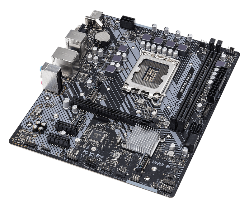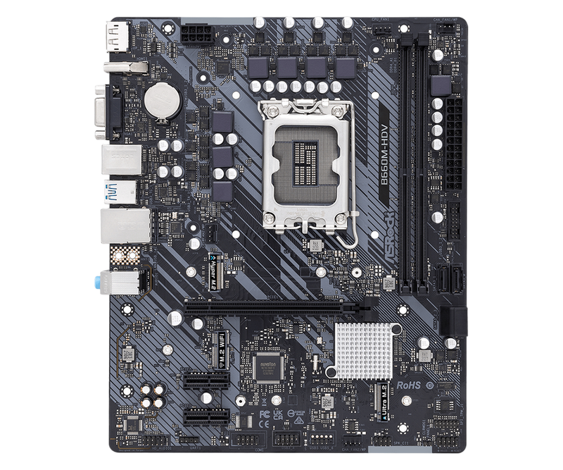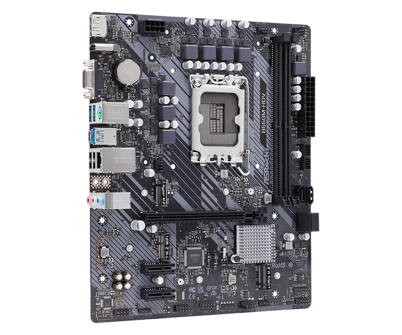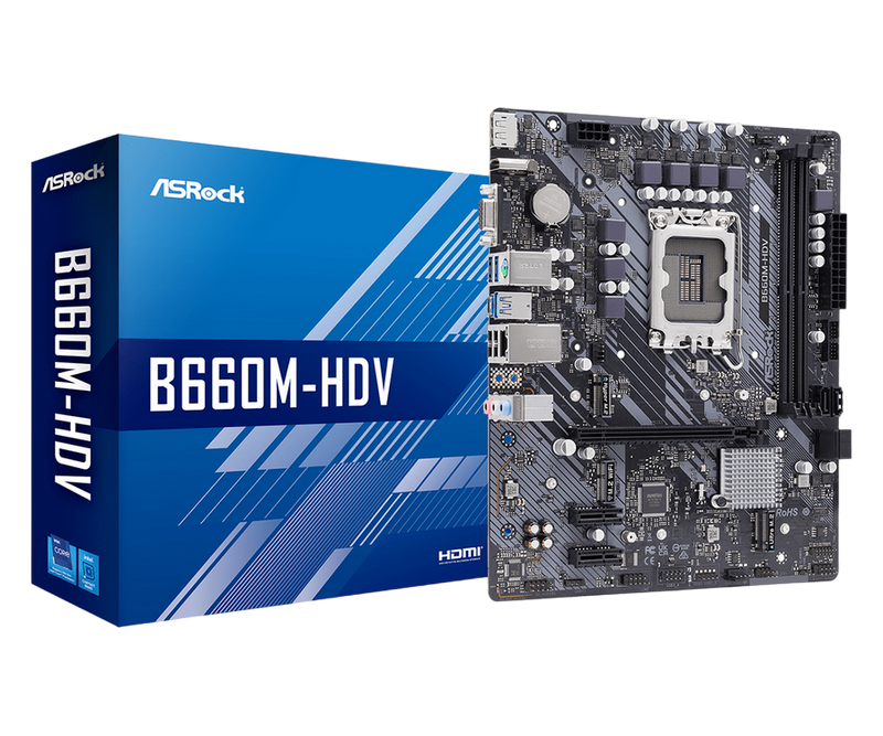 // CPU Supports 12th Gen Intel® Core™ Processors (LGA1700) Chipset - Intel® B660 Memory - Dual Channel DDR4 Memory Technology - 2 x DDR4 DIMM Slots - Supports DDR4 non-ECC, un-buffered memory up to 5066+(OC)* - Max. capacity of system memory: 64GB Graphics - Intel® Xe Graphics Architecture (Gen 12) - Three graphics output options: D-Sub, HDMI and DisplayPort 1.4 - Supports HDMI 2.1 TMDS Compatible with max. resolution up to 4K x 2K (4096x2160) @ 60Hz - Supports DisplayPort 1.4 with DSC (compressed) max. resolution up to 8K (7680x4320) @ 60Hz - Supports D-Sub with max. resolution up to 1920x1200 @ 60Hz Audio - 7.1 CH HD Audio (Realtek ALC897/887 Audio Codec) LAN - Gigabit LAN 10/100/1000 Mb/s - Giga PHY Intel® I219V Slots - 1 x PCIe Gen4x16 Slot* - 2 x PCIe Gen3x1 Slots - 1 x M.2 Socket (Key E), supports type 2230 WiFi/BT PCIe WiFi module Storage - 4 x SATA3 6.0 Gb/s Connectors* - 1 x Hyper M.2 Socket (M2_1, Key M), supports type 2260/2280 PCIe Gen4x4 (64 Gb/s) mode** - 1 x Ultra M.2 Socket (M2_2, Key M), supports type 2260/2280 SATA3 6.0 Gb/s & PCIe Gen3x4 (32 Gb/s) modes** - Supports RAID 0, RAID 1, RAID 5 and RAID 10 for SATA storage devices USB - 3 x USB 3.2 Gen1 Type-A Ports (Supports ESD Protection) - 1 x USB 3.2 Gen1 Type-C Port (Supports ESD Protection) - 2 x USB 2.0 Ports (Supports ESD Protection) - 2 x USB 2.0 Headers (Support 3 USB 2.0 ports) (Supports ESD Protection) - 1 x USB 3.2 Gen1 Header (Supports 2 USB 3.2 Gen1 ports) (Supports ESD Protection) https://www.asrock.com/mb/Intel/B660M-HDV/index.asp#Overview