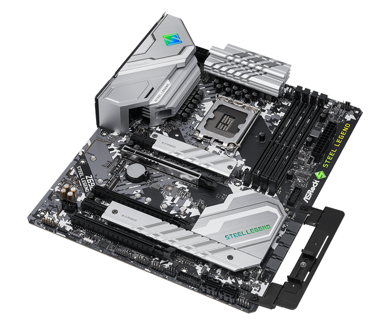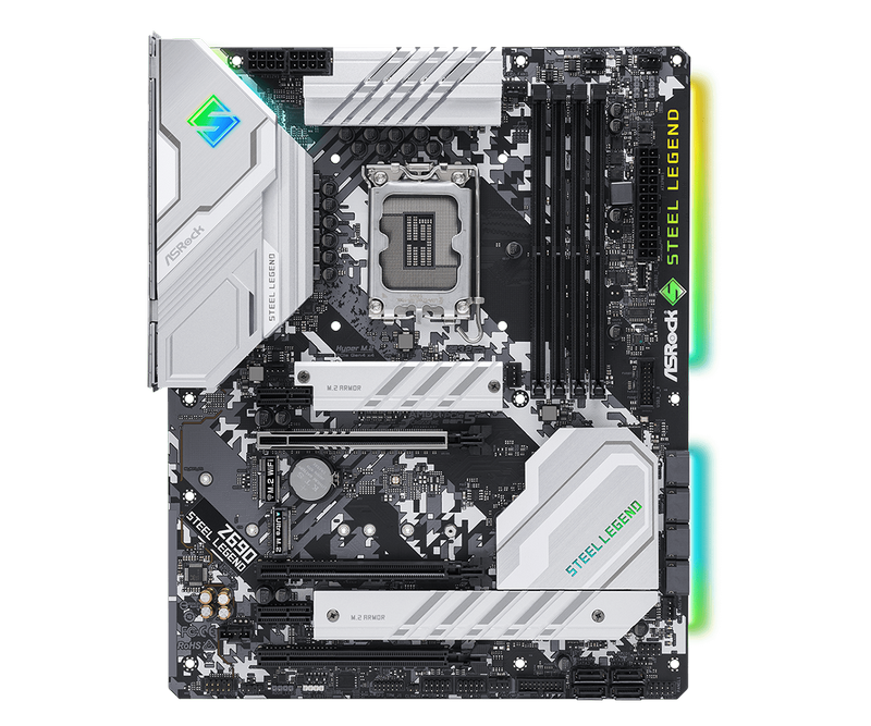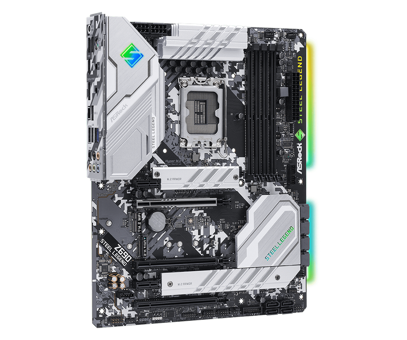 // CPU Supports 12th Gen Intel® Core™ Processors (LGA1700) Chipset - Intel® Z690 Memory - Dual Channel DDR4 Memory Technology - 4 x DDR4 DIMM Slots - Supports DDR4 non-ECC, un-buffered memory up to 5000+(OC)* - Max. capacity of system memory: 128GB Graphics - Intel® Xe Graphics Architecture (Gen 12) - Dual graphics output: support HDMI and DisplayPort 1.4 ports by independent display controllers - Supports HDMI 2.1 TMDS Compatible with max. resolution up to 4K x 2K (4096x2160) @ 60Hz - Supports DisplayPort 1.4 with DSC (compressed) max. resolution up to 8K (7680x4320) @ 60Hz Audio - 7.1 CH HD Audio (Realtek ALC897 Audio Codec) LAN - 2.5 Gigabit LAN 10/100/1000/2500 Mb/s - Dragon RTL8125BG Slots - 3 x PCIe x16 Slots (PCIE2/PCIE3/PCIE5: single at Gen5x16 (PCIE2); dual at Gen5x16 (PCIE2) / Gen4x4 (PCIE3); triple at Gen5x16 (PCIE2) / Gen4x4 (PCIE3) / Gen3x4 (PCIE5))* - 2 x PCIe Gen3x1 Slots - 1 x M.2 Socket (Key E), supports type 2230 WiFi/BT PCIe WiFi module and Intel® CNVi (Integrated WiFi/BT) Storage - 8 x SATA3 6.0 Gb/s Connectors* - 1 x Hyper M.2 Socket (M2_1, Key M), supports type 2260/2280 PCIe Gen4x4 (64 Gb/s) mode** - 1 x Ultra M.2 Socket (M2_2, Key M), supports type 2230/2242/2260/2280 SATA3 6.0 Gb/s & PCIe Gen3x4 (32 Gb/s) modes** - 1 x Hyper M.2 Socket (M2_3, Key M), supports type 2242/2260/2280/22110 PCIe Gen4x4 (64 Gb/s) mode** - Supports RAID 0, RAID 1, RAID 5 and RAID 10 for SATA storage devices - Supports RAID 0, RAID 1 and RAID 5 for M.2 NVMe storage devices USB - 1 x USB 3.2 Gen2 Type-A Port (10 Gb/s) (ReDriver) (Supports ESD Protection) - 1 x USB 3.2 Gen2 Type-C Port (10 Gb/s) (ReDriver) (Supports ESD Protection) - 4 x USB 3.2 Gen1 Ports (Supports ESD Protection) - 2 x USB 2.0 Headers (Support 4 USB 2.0 ports) (Supports ESD Protection) - 2 x USB 3.2 Gen1 Headers (Support 4 USB 3.2 Gen1 ports) (ASMedia ASM1074 hub) https://www.asrock.com/mb/Intel/Z690%20Steel%20Legend/#Overview