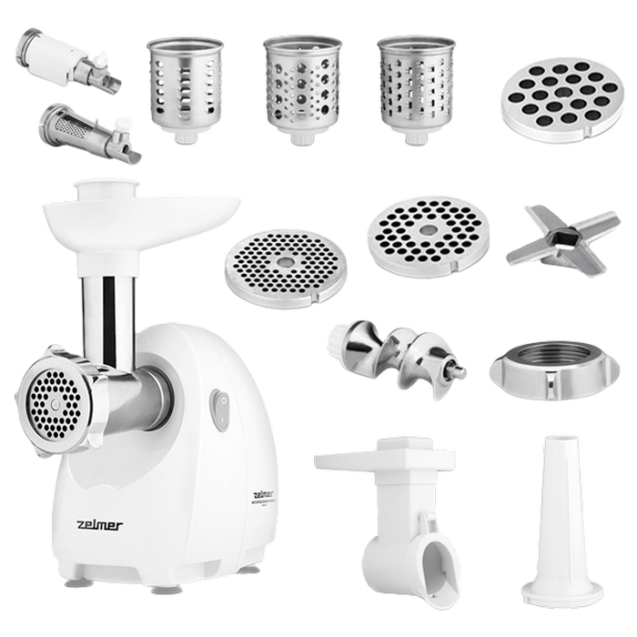 , 1700W power output, 2 perforated discs 5/7mm, 3 grating and slicing attachments, grinding speed 1,5kg / min, brown