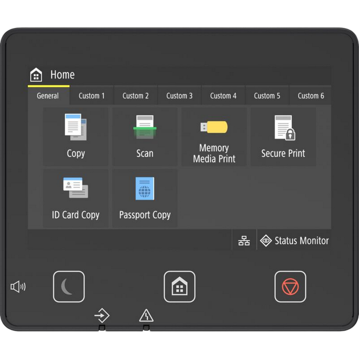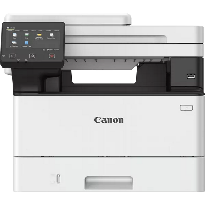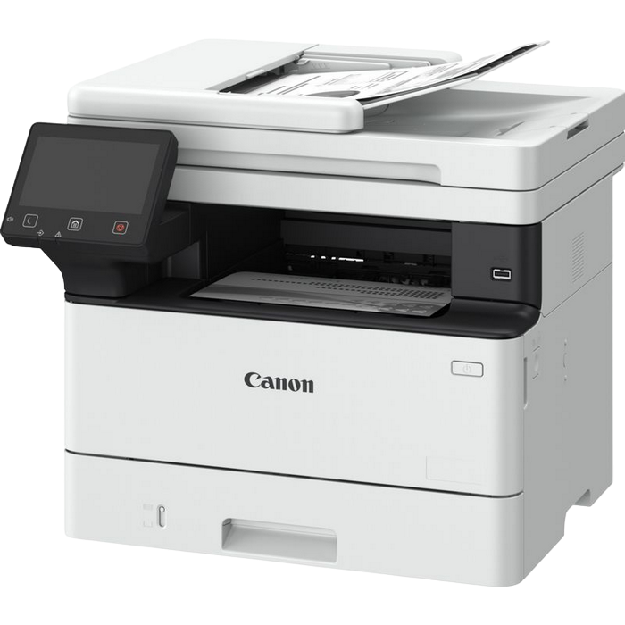 MFD, A4, 40 ppm, DADF, Ethernet, WiFi Available Functions: Print, Copy and Scan Print Speed: Single sided : Up to 40 ppm (A4), Up to 65.4 ppm(A5-Landscape) Double sided : Up to 33.6 ipm (A4) Printing Method: Monochrome laser beam printing Print Resolution: Up to 1200 x 1200 dpi Warm-up Time: Approx. 14 seconds or less from power on First-Print-Out Time: Approx: 5.0 seconds or less Printer Languages: UFRII, PCL 5e, PCL6, Adobe® PostScript3 Fonts: 45 PCL fonts, 136 PS fonts Print Margins: 5 mm-top, bottom, left and right Advanced Printing Features: Encrypted Secure Print, Secure Print,Print from USB memory key (JPEG/TIFF/PDF), Print from Cloud: uniFLOW Online, Dropbox, GoogleDrive, OneDrive (PDF/JPEG) Universal Print by Microsoft, Barcode Print, iOS: AirPrint, Canon PRINT Business app Android; Mopria certified, Canon Print Service Plug-in, Canon PRINT Business app Copy Specifications Copy Speed: Single sided (A4): Up to 40 ppm, Double sided (A4): Up to 33.6 ipm First-Copy-Out Time: Approx. 6.1 seconds or less Copy Resolution: Up to 600 x 600 dpi Copy Modes: Text, Text/Photo (Default),Text/Photo (High Quality), Photo Double Sided Copying: 2-sided to 2-sided (Automatic) Multiple Copies: Up to 999 copies Reduction / Enlargement: 25-400% in 1% increments Other Features: Frame Erase, Collate, 2 on 1, 4 on 1, ID card copy Scan Specifications Standard Type: Colour Scan Resolution: Optical: Up to 600 x 600 dpi, Enhanced: Up to 9600 x 9600 dpi Scan Speed: Single sided mono: 50ipm (300x300dpi) Single sided colour: 40ipm (300x300dpi) Double sided mono: 100ipm (300x300dpi) Double sided colour: 80ipm (300x300dpi) Single sided mono: 40ipm (300x600dpi) Single sided colour: 20ipm (300x600dpi) Double sided mono: 80ipm (300x600dpi) Double sided colour: 40ipm (300x600dpi) Colour Scanning Depth: 24 bit/24 bit (input/output) Greyscales: 256 levels Compatibility: TWAIN , WIA, ICA Maximum Scan Width: 216mm Scan to E-mail, Scan to PC, Scan to USB Memory Key, Scan to FTP, Scan to Cloud, iFAX ITU-T.37 Paper Input (Standard): 250-sheet cassette, 100-sheet multi-purpose tray Paper Input (Option): 550-sheet cassette Maximum Paper Input Capacity: 900 sheets Paper Output: 150-sheet Media Types: Plain paper, Recycled paper, Heavy Paper, Thin paper, Colour paper, Coated paper, Label, Post card, Envelope Media Sizes: Cassette (Standard and optional): A4, A5, A5 (Landscape), A6, B5, Legal, Letter, Executive, Statement, OFFICIO, B-OFFICIO, M-OFFICIO, GLTR, GLGL, Foolscap, 16K, Custom sizes: Min. 105 x 148 mm Max. 216.0 x 355.6 mm. Multi-purpose tray: A4, A5, A5 (Landscape), A6, B5, Legal, Letter, Executive, Statement, OFFICIO, B-OFFICIO, M-OFFICIO, GLTR, GLGL, Foolscap, 16K, Indexcard, Envelope (COM10, Monarch, C5, DL), Custom sizes: Min 76.2 x 127 mm Max. 216.0 x 355.6 mm. ADF: A4, A5, A6, B5, Legal, Letter, Statement, Custom sizes: Min. 48 x 85.0 mm Max 216 x 355.6 mm Media Weights: Cassette (standard and optional): 60 to 120 g/m², Multi-purpose tray: 60 to 199 g/m² Double Sided Printing: 60 to 120 g/m² Recommended Monthly Print Volume: 750 - 4,000 pages per month Duty Cycle: Max. 80,000 pages per month Processor Speed: 1200MHz Memory: 1GB Storage: 4GB eMMC Control Panel: 12.7 cm LCD Colour Touch Screen Interface: USB 2.0 Hi-Speed, 10BASE-T/100BASE-TX/1000Base-T, Wireless 802.11b/g/n, Wireless Direct Connection Consumables Not included in the box: Cartridges TONER T13 (10,600 pages)