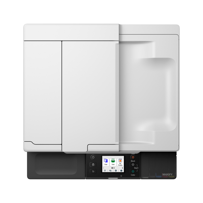 MFD A4, Wi-Fi, Ethernet, Print, Copy, Scan, Fax & Cloud Print Resolution: Up to 600 x 1200 dpi Print Margins (min.): Top: 5 mm, Bottom: 5 mm, Right: 5 mm, Left: 5 mm Print Technology: 2 Print Heads, Refillable ink tank printer Mono Print Speed: approx. 15.0 ipm Colour Print Speed: approx.10.0 ipm First-Print-Out Time: Mono: 9 sec (ready / simplex), Colour: 11 sec (ready/simplex) Two Sided Printing: A4, Letter - Plain Paper Maximum Paper Input: Cassette: Max. 250 sheets (plain paper) ADF: A4, LTR = 35, LGL = 5, others = 1 Paper Sizes:A4, A5, B5, LTR, LGL, B-Oficio, M-Oficio, Foolscap, Executive,#10 Envelope, DL Envelope, C5 Envelope, Monarch Envelope, 4" x 6", 5" x 7", 7" x 10", 8" x 10", Custom size (width:89 mm - 216 mm, length: 127 mm - 355.6 mm) ADF: A5, A4, LTR, LGL Paper Weight: Plain Paper: 64 g/m2 - 105 g/m2, or supported genuine Canon papers Canon paper: Max. paper weight Approx. 265 g/m2 Scanner Type: Flatbed (ADF / Platen) CIS colour scanner Scanner Resolution (Optical): 1,200 x 2,400 dpi Line Scanning Speed: Colour: 3.5 ms/line (300 dpi), Greyscale: 1.5 ms/line (300 dpi) Scanning Depth (Input / Output): Colour: RGB each 16bit/8bit, Greyscale: 16 bit / 8 bit Maximum Document Size: Platen: A4/Letter (216 x 297 mm), ADF: A4/Letter/Legal (216 x 356 mm) Display Type & Size: 2.7" / 6.7cm LCD (Touch Screen, Color) Fax Type: Desktop Transceiver (Super G3/Color Communication) Fax Resolution: Mono: 8pels/mm x 3.85 lines/mm (Standard), 8pels/mm x 7.7 lines/mm (Fine), 300 dpi x 300 dpi (Extra Fine) Colour: 200 x 200 dpi, Fax Speed: Mono: approx. 3 sec., Colour: approx. 1 min. Interface: Hi-Speed USB (B Port), Ethernet: 10/100Mbps (auto switchable), Wi-Fi: IEEE802.11 b/g/n/a/ac Consumables: Standard Ink Bottles GI-45 BK, 3,000 pages (Economy mode 4,500 pages) GI-45 C, 3,000 pages (Economy mode 4,500 pages) GI-45 M, 3,000 pages (Economy mode 4,500 pages) GI-45 Y, 3,000 pages (Economy mode 4,500 pages) Maintenance Cartridge: MC-G05 (User Replaceable)