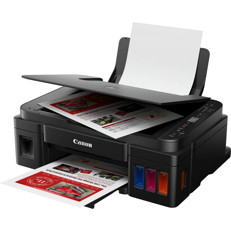 MFD A4, Wi-Fi, Print, Copy, Scan, Cloud Link Print Resolution: Up to 4800 x 1200 dpi Print Technology: 2 FINE Cartridges (Black and Colour), refillable ink tank printer Mono Print Speed: Approx. 8.8 ipm Colour Print Speed: Approx. 5.0 ipm Photo Print Speed: Borderless 10x15cm : Approx. 60 seconds Borderless Printing: Yes (A4, Letter, 20x25cm, 13x18cm, 13x13cm, 10x15cm) Scanner Type: CIS flatbed photo and document scanner Scanner Resolution (Optical): 600 x 1200 dpi A4 Scan Speed: Approx. approx. 19 sec Scanning Depth (Input / Output): Colour: 48 bit / 24 bit Greyscale: 16 bit / 8 bit Maximum Document Size: 216 x 297 mm Maximum Paper Input: Rear tray: Max. 100 sheets (plain paper) Paper Sizes: A4, A5, B5, 10x15cm, 13x18cm, 20x25cm, Envelopes (DL, COM10), Letter, Legal Paper Weight: Plain paper: 64 - 105 g/m², Canon photo paper: up to 275 g/m² Display Type & Size: LCD (1.2 inch segment mono) Interface Type - PC / Mac: Hi-Speed USB (B Port), Wi-Fi: IEEE802.11 b/g/n, Wi-Fi Security: WPA-PSK, WPA2-PSK, WEP, Administration password Standard Ink Cartridges: GI-490 PGBK, 6000 pages GI-490 C , 7000 pages GI-490 M, 7000 pages GI-490 Y, 7000 pages
