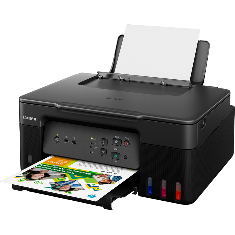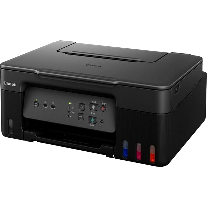 MFD A4, Print, Scan & Copy, Cloud, Wi-Fi Print Resolution: Up to 4800 x 1200 dpi Print Technology: 2 FINE Print Head (Black and Colour), Refillable ink tank printer Mono Print Speed: approx. 11 ipm Colour Print Speed: approx. 6.0 ipm Photo Print Speed: Borderless 10x15cm : Approx. 45 seconds Borderless Printing: Yes A4, B5, LTR, 4" x 6", 5" x 7", 7" x 10", 8" x 10", Square (89 mm x 89 mm), Square (127 mm x 127 mm), Card Size (91 mm x 55 mm) Two Sided Printing: No, Manual operation Maximum Paper Input: Rear Tray: Max. 100 sheets (plain paper) Paper Weight: Rear Tray: Plain paper: 64 - 105 g/m² Canon specialty paper: max paper weight : approx. 265 g/m² (Photo Paper Plus Glossy II PP-201) Scanner Type: CIS flatbed photo and document scanner Scanner Resolution (Optical): 600 x 1200 dpi Line Scanning Speed: Colour: 3.5 ms/line (300dpi), Greyscale: 1.5 ms/line (300dpi) Scanning Depth (Input / Output):Colour: RGB each 16bit/8bit, Greyscale: 16 bit/8 bit Maximum Document Size: A4/LTR Interface: Hi-Speed USB (USB B Port), Wi-Fi: IEEE802.11 b/g/n Wi-Fi Security: WPA-PSK, WPA2-PSK, WEP, Administration password Wireless LAN Frequency Band: 2.4 GHz Wireless PictBridge Cartridges: Standard ink bottles (included): Black: 3,100 pages (Economy mode 3,900 pages), Colour: 4,400 pages (Economy mode 4,600 pages) GI-41S