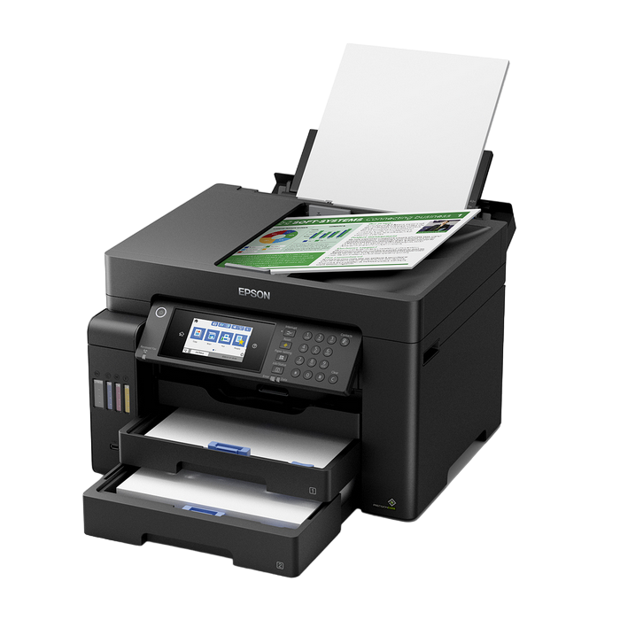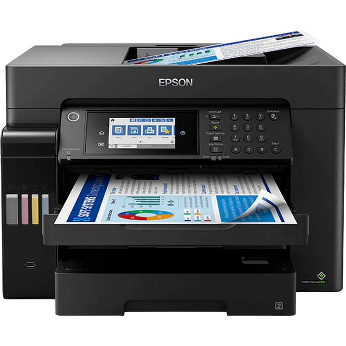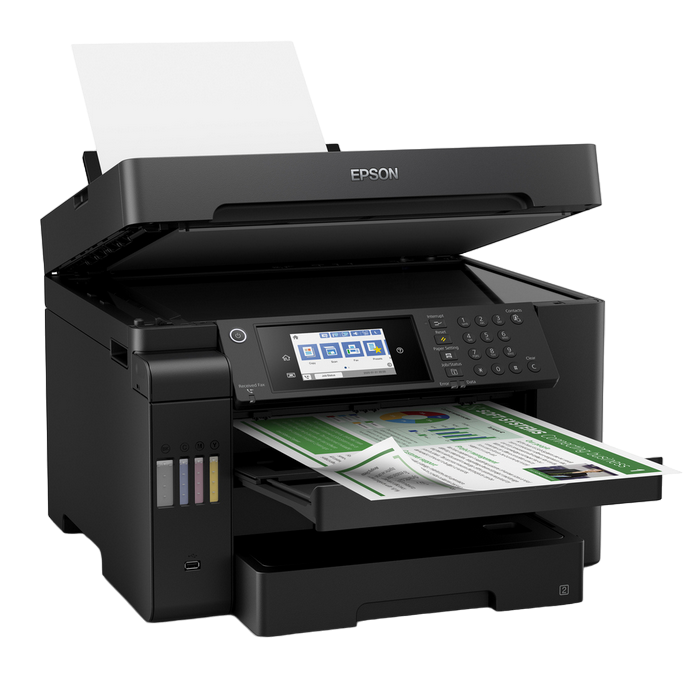 Принтер-сканер-копир-факс для сверхэкономичной печати документов, ADF 50 листов Печать формата А3+ Максимальное разрешение, 4800x2400 dpi Минимальный объем капли, 3.8 пл Печать без полей Фронтальный лоток на 500 листов Емкость выxодныx лотков, 125 листов Фронтальные чернильные емкости Максимальная скорость черно-белой печати A4 (драфт), 32 стр/мин Скорость черно-белой печати A4 (ISO), 25 стр/мин Максимальная скорость цветной печати A4 (драфт), 32 стр/мин Скорость цветной печати A4 (ISO), 25 стр/мин Скорость печати в двустороннем режиме A4, 21 стр/мин Максимальное разрешение копира (ч/б) 1200x2400 Максимальное разрешение копира (цветн.) 1200x2400 Пигментные чернила всех цветов Количество контейнеров 4 Инновационная система заправки чернил «Key Lock» Сканер: Максимальный формат оригинала A3 Разрешение сканера, 1200x2400 dpi ЖК-дисплей диагональю 10,9 см с сенсорной панелью управления Набор контейнеров в комплекте поставки рассчитан на 7500 ч/б и 6000 цветных отпечатков Сменная ёмкость для отработанных чернил Автоматическая двусторонняя печать (А3) Автоподатчик для сканирования документов (А3), 50 листов Интерфейс: USB тип B, Ethernet, Wi-Fi, Печать по Wi-Fi Direct, Epson Connect Контейнеры с чернилами: C13T06C14A, Black, 127 ml C13T06C24A, Cyan. 70 ml C13T06C34A, Magenta, 70 ml C13T06C44A, Yellow, 70 ml C12C934591 - Емкость для отработанных чернил Ресурс контейнера с черными чернилами, 7500 ч/б страниц Ресурс 3-х контейнеров с голубыми, пурпурными и желтыми чернилами, 6000 цветных страниц