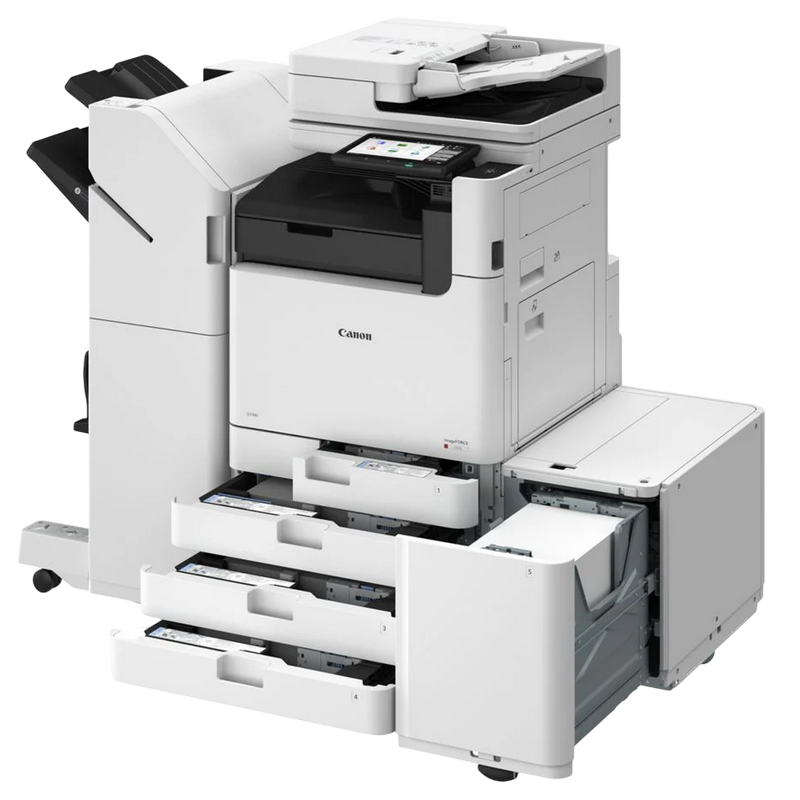 Digital Colour MFP A3 Main Unit Machine Type: A3 Colour Multifunctional Core Functions: Print, Copy, Scan, Send, Store and Optional Fax Processor Speed: 1.8GHz Dual Core Processor Control Panel: 10.1" TFT LCD WSVGA Colour Touch panel Memory: RAM: 6GB Storage: Standard: (SSD) 256GB, Optional: (SSD) 1TB Interface Connection: NETWORK Standard: 1000Base-T/100Base-TX/10Base-T Optional: Wireless LAN (IEEE 802.11a/b/g/n/ac/ax) OTHERS Standard: USB 2.0 (Host) x1, USB 3.0 (Host) x1, USB 2.0 (Device) x1 Optional: Serial Interface, Copy Control Interface Network Protocols: File: FTP(TCP/IP), SMB3.0 (TCP/IP), WebDAV, E-mail/I-Fax: SMTP, POP3 Paper Supply Capacity (A4, 80 gsm): Standard: 1.200 sheets: 100-sheet Multi-purpose tray x 1, 550-sheet Paper cassette x 2 Maximum: 6,350 sheets (with High Capacity Cassette Feeding Unit-F1 + Paper Deck Unit-F2) Paper Output Capacity (A4, 80 gsm): Maximum: 3,450 Sheets (with Staple Finisher-AB3 or Paper Folding/Booklet Finisher-A2 and 3rd Copy Tray Kit-A1) Supported Media Weights: Multi-purpose tray: 52 to 300 gsm Paper Cassette (Upper): 52 to 256 gsm Paper Cassette (Lower): 52 to 300 gsm Duplex: 52 to 256 gsm Warm-up Time: Quick Startup Mode: 4 Seconds or less From Sleep Mode: 6 Seconds or less From Power On: 6 Seconds or less Print Specifications Print Speed: up to 40 ppm (A4, A5*, A5R, A6R*), up to 21 ppm (A3), up to 24 ppm (A4R), *1-sided only Print Resolution (dpi): 4,800 x 2,400 Page Description Languages: Standard: UFR II, PCL6, Adobe® PostScript®3TM Double-Sided Printing: Yes Direct Print: Supported file types: PDF, EPS, TIFF/JPEG, and XPS Copy Specifications Copy Speed: up to 40 ppm (A4, A5*, A5R, A6R), up to 21 ppm (A3), up to 24 ppm (A4R), * 1-sided only First-Copy-Out Time: Approx. 4.1 / 6.1 seconds or less Copy Resolution (dpi): 600 x 600 Multiple Copies: Up to 999 copies Magnification: Variable zoom: 25% to 400% (1% Increments) Scan Specifications Type: Single-pass Duplexing Automatic Document Feeder, 2-sided to 2-sided (Automatic) Pull Scan Specifications Colour Network ScanGear2. For both TWAIN and WIA Scan Resolution (dpi): 600 x 600 Acceptable Originals/Weights: Document Feeder media weight: 1-sided scanning: 38 to 220 gsm (BW, CL) 2-sided scanning: 38 to 220 gsm (BW, CL) Scan Speed: 1-sided Scanning: 135/135 ipm (300 x 300 dpi, send), 80/80 ipm (600 x 600 dpi, copy) 2-sided Scanning: 270/270 ipm (300 x 300 dpi, send), 160/90 ipm (600 x 600 dpi, copy) Double-Sided Scanning: Yes Send Specifications Standard Destination: Standard: E-mail/Internet FAX (SMTP*), SMB3.0, FTP, WebDAV, Mail Box Optional: Super G3 FAX, IP Fax Address Book / Speed Dials: LDAP (2,000)/Local (1,600)/Speed dial (200) Send Resolution (dpi): Push: up to 600 x 600, Pull: up to 600 x 600 Consumables: Not included in the box Toner Estimated Yield, @ 5% Coverage) Toner 1001 BK: 63,000 pages Toner 1001 C/M/Y: 54,500 pages Toner 1001L C/M/Y: 24,000 pages