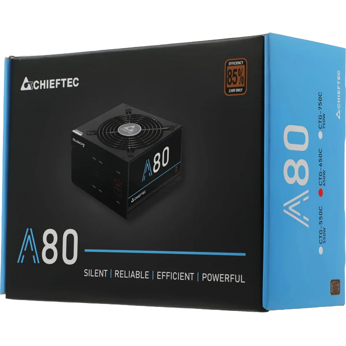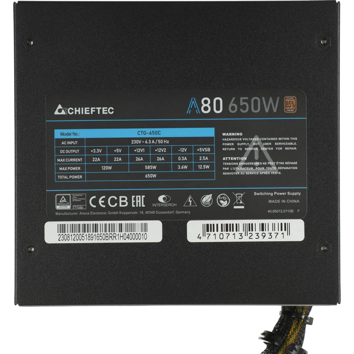 . Performance AC Input: 230V / 6,3A Frequency: 50 Hz +5V: 22A +3,3V: 22A +5V & +3,3V combined: 120W +12V 1: 26A +12V 2: 26A +12V 1 & +12V 2 combined: 585W +12V 3: N/A +12V 4: N/A +12V 3 & +12V 4 combined: N/A P.F.: >0,9 -12V: 0,3A / 3,6W +5VSB: 2,5A / 12,5W Maximum Load: 650W Native cable: 24PIN ATX: 1 SATA: - MOLEX: - Floppy: - 4PIN 12V: - 8PIN 12V: - 8PIN (4+4) 12V: 1 6PIN PCIe: - 8PIN (6+2) PCIe: - Modular cable: 20+4PIN ATX: - SATA: 6 MOLEX: 4 Floppy: - 4PIN 12V: 2 8PIN 12V: - 8PIN (4+4) 12V: - 6PIN PCIe: - 8PIN (6+2) PCIe: 2 Spezification: ATX 12V 2.3 Form factor: PS II Efficiency: > 85% Dimension (DxWxH): 140 mm x 150 mm x 87 mm PFC: Active PFC (0,9) Fan: 120mm silent fan Security: UVP (Undervoltage protection) OVP (Overvoltage protection) SCP (Short-circuit protection) OPP (Overload protection) AFC (Automatic Fanspeed Control) SIP (Surge & Inrush Protection) Warranty: 24 Month https://www.chieftec.eu/en/psus/ps-2/a-80-series/ctg-650c.html