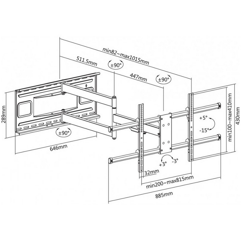 Dimensiune minimă Ecran: 43 " Dimensiune maximă Ecran: 80 " Greutate maximă de încărcare: 50 kg Interval de înclinare: +5°/-15° Balama: ±90° Compatibilitate cu suportul VESA: 200 x 200, 300 x 200, 300 x 300, 400 x 200, 400 x 300, 400 x 400, 600 x 400, 800 x 400