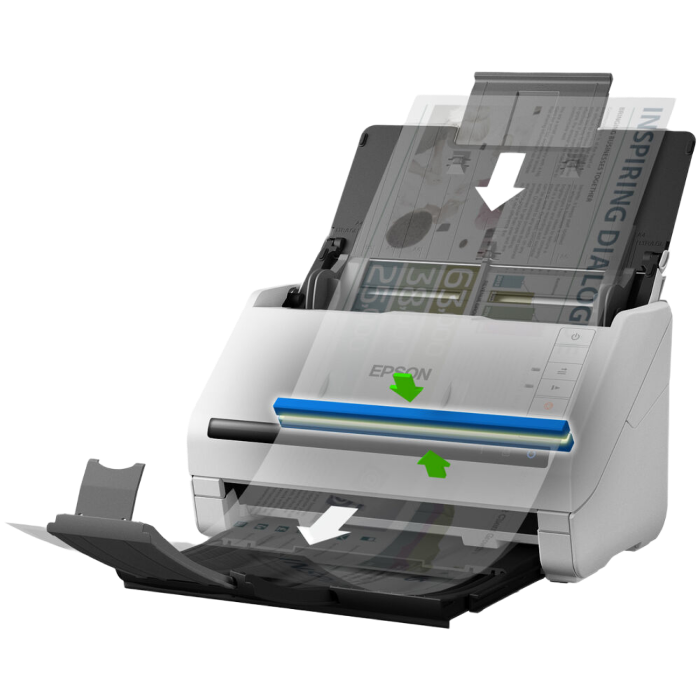 Business scanner Scanner Type: Sheetfed Scanner Scanning Speed: Monochrome: 35 pages/min - Color: 35 pages/min measured with Size: A4, Resolution:200/300 dpi, Monochrome: 70 image/min - Color: 70 image/min measured with Size: A4, Resolution:200/300 dpi Optical Resolution: 600 DPI x 600 DPI (Horizontal x Vertical) ADF Minimum Document Size: 50,8 mm x 50,8 mm (Horizontal x Vertical) ADF Maximum Document Size: 215,9 mm x 6.096 mm (Horizontal x Vertical) Paper Formats: A4 (21.0x29.7 cm), A5 (14.8x21.0 cm), A6 (10.5x14.8 cm), B5, B6, Letter, Postcard, Business cards, Plastic cards, Legal, Executive Scanning color depth: Input: 30 Bits Color / 10 Bits Monochrome , Output: 24 Bits Color/8 Bits Monochrome Ultrasonic Sensor: Yes Category: High Capacity, General Office Light Source: ReadyScan LED technology Output Resolution: 75, 100, 150, 200, 240, 300, 600, 1200 DPI Paper weight: Auto loading: 27 - 413 g/m² Automatic Document Feeder Type: Single pass dual scanning Reliability Daily Duty Cycle: 4.000 pages Automatic Document Feed: 50 pages Duplex Scan: Yes Output formats: JPEG, TIFF, multi-TIFF, PDF, searchable PDF, secure PDF, PDF/A Interfaces: USB 3.2 Gen 1x1 Accessories: B12B819051, Carrier Sheet (set of 5) B12B819291, Cleaning Kit B12B819011FB, Flatbed Scanner Conversion Kit B12B819671, Roller Assembly Kit What's in the box: Driver and utilities (CD), Main unit, Power cable, Setup guide, USB cable, Warranty document