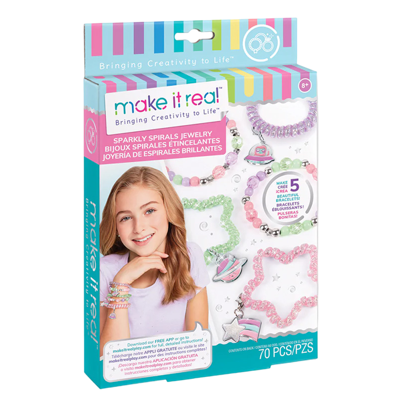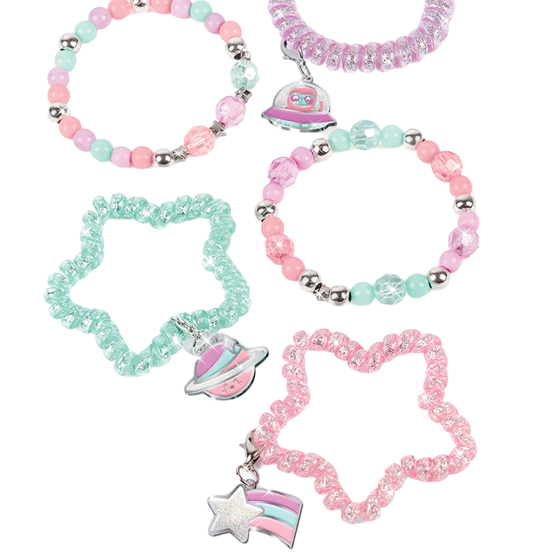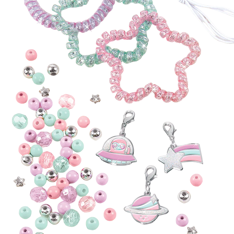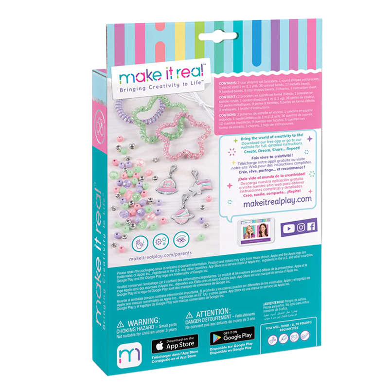 Creați șase brățări spiralate strălucitoare în forme de stea și circulare la modă cu acest set de bijuterii de 70 de piese Kitul include: 2 brățări spiralate în formă de stea 1 brățară spirală în formă rotundă Cordon elastic 1 m 36 mărgele colorate 12 mărgele metalice 9 mărgele fațetate 5 mărgele în formă de stea 3 amulete Ghid de utilizare