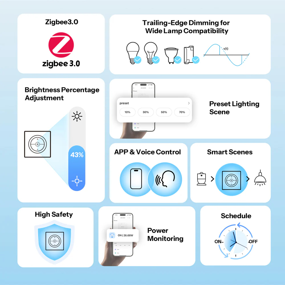 Variatorul ofera o experienta de reglare a luminozitatii inteligenta si fara palpaire. Tehnologia de calibrare automata si manuala asigura compatibilitatea cu o gama larga de surse de lumina, inclusiv LED-uri dimabile, becuri incandescente, lampi cu halogen si transformatoare electronice dimabile. Prin aceasta adaptare, sunt reduse semnificativ fluctuatiile neplacute de luminozitate si schimbarile bruste de intensitate, rezultand o gradare lina, continua si apropiata de lumina naturala, ideala pentru confort vizual.