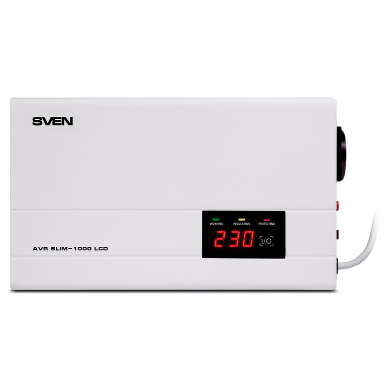 - http://www.sven.fi/ru/catalog/stabilizer/avr_slim_1000.htm AVR type relay Total power, VА ≤1000 Maximal output power, W ≤800 Maximum load, W ≤800 Input voltage, V ~140 – 260 Output voltage, V ~220 ± 10 % Input frequency, Hz 50 Output frequency, Hz 50 Output sockets 1 × СЕЕ7/4 Protection against high/low voltage in the power supply network, high-frequency and impulse interferences, overload and short circuit; built-in thermal protection Protection operating current, A 7 Typical switching time, ms ≤ 10 Indication output voltage level Indicators Delaying / protection, Working, Regulating Fuse bimetallic circuit breaker Input plug 1 × СЕЕ7/7 Environmental temperature, °С 0 to +40 Relative humidity, % 10 ~ 90 (without condensation) Cable length, m 1.3 Case material metal Dimensions, mm 290 × 175 × 60 Weight, kg 2.9 Color light grey Product life 5 years SLIM METAL HOUSING WITH WALL-MOUNTING FASTENERS