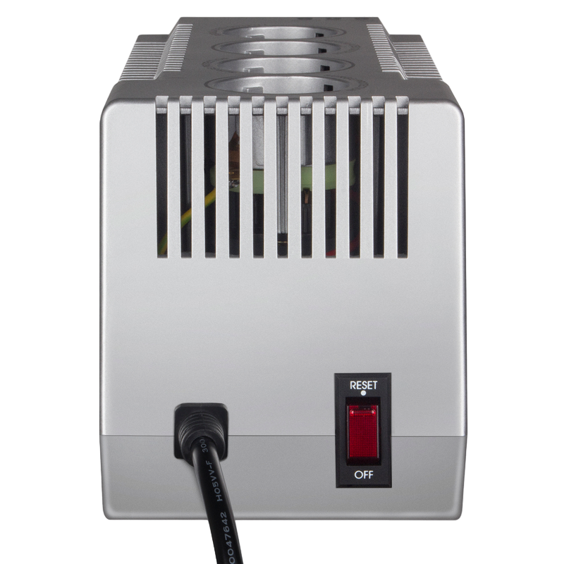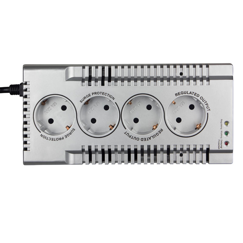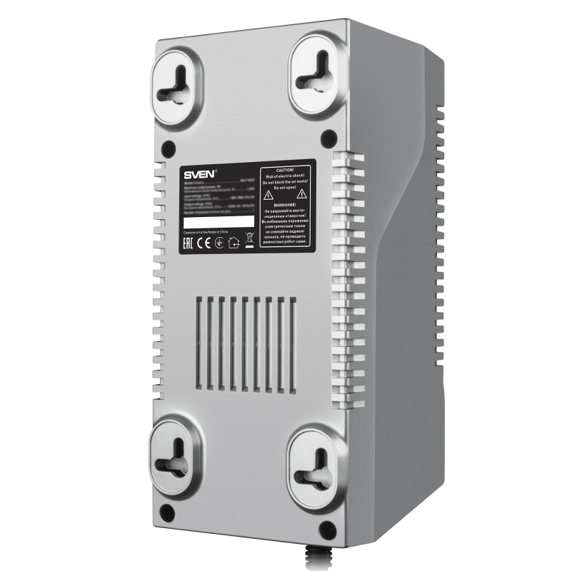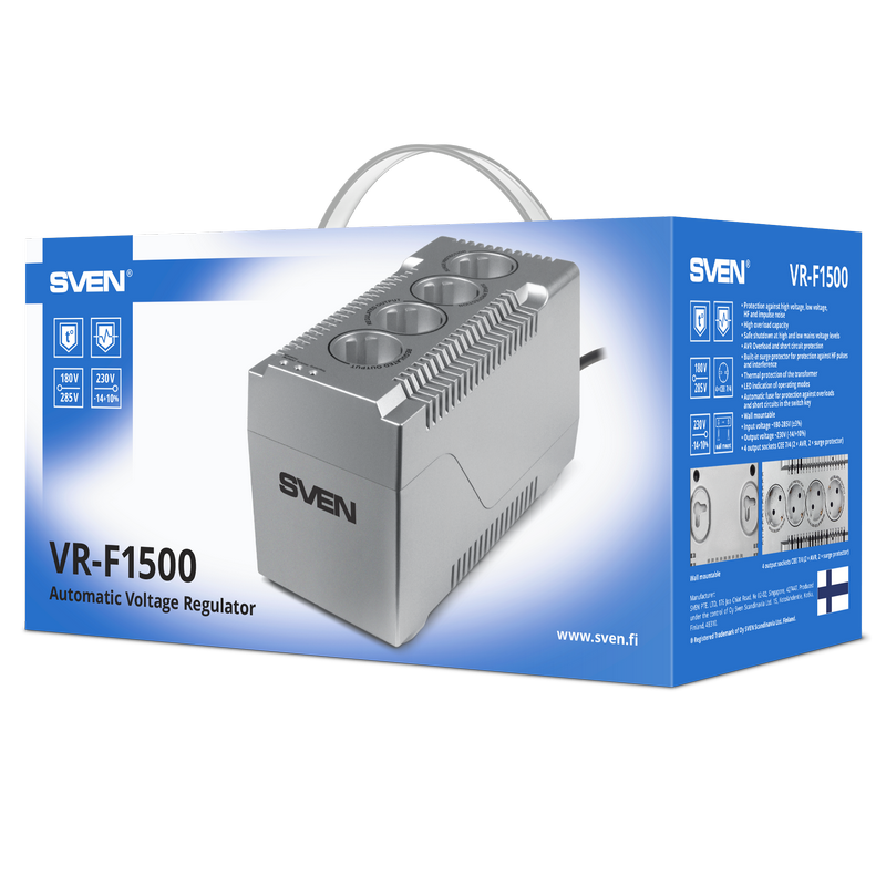 - http://www.sven.fi/en/catalog/stabilizer/vr-f1500.htm Maximal output power, W ≤500 Input voltage, V ~180V-285V±3% Output voltage, V ~230 (-14/+10%) Input frequency, Hz 50 Output frequency, Hz 50 Input socket 1 × СЕЕ7/7 Output sockets 4 × CEE7/4 (2 for AVR, 2 for surge protection) Protection operating current, A 7 Typical switching time, ms ≤10 Environmental temperature, °С 0 to +40 Relative humidity, % 10 ~ 90 (without condensation) Dimensions, mm 230 × 120 × 102 Weight, kg 1.92 WALL MOUNT OPTION