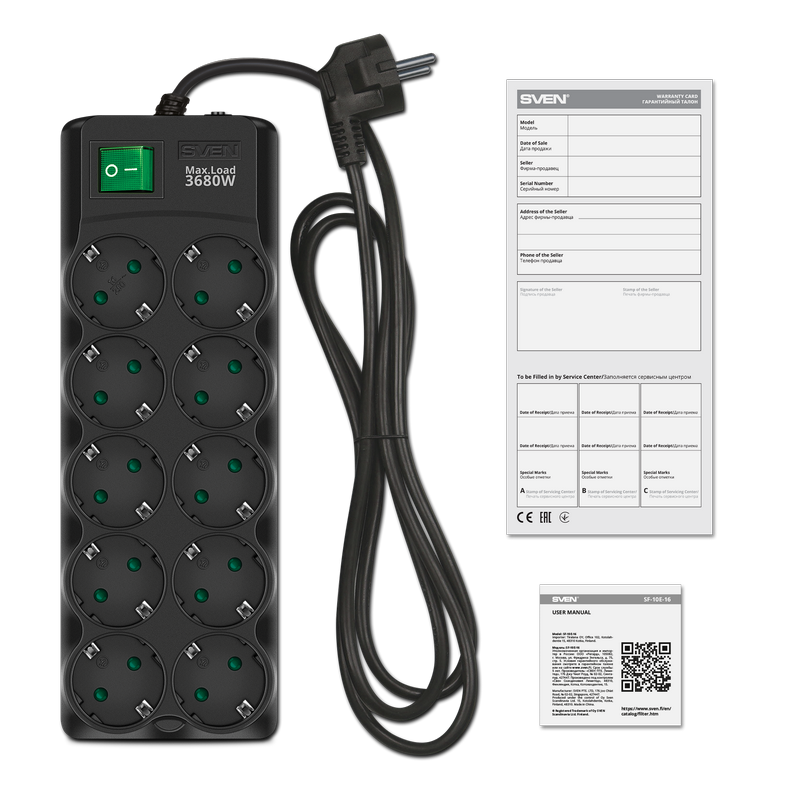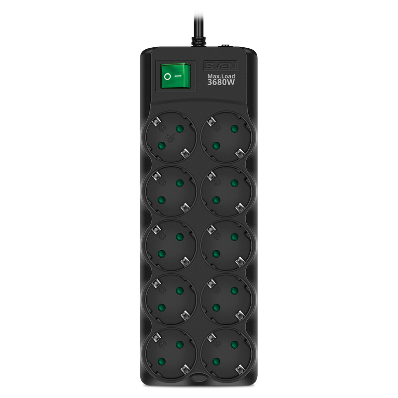 Surge Protector 10 Sockets, 3m, Sven "SF-10E-16", Black, flame-retardant material, 16A