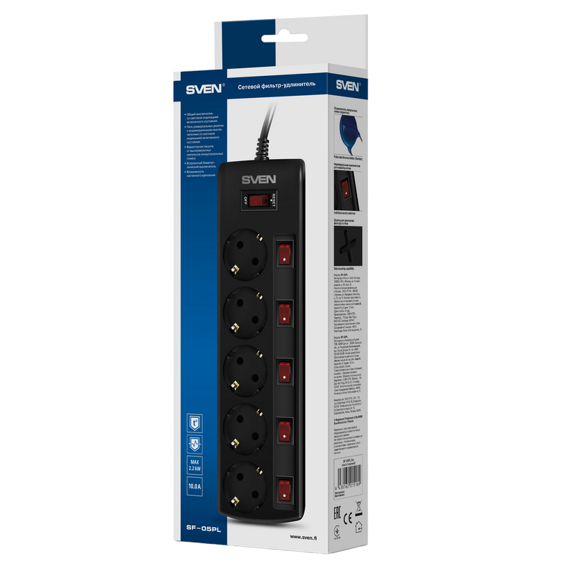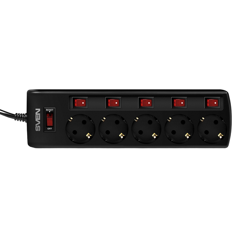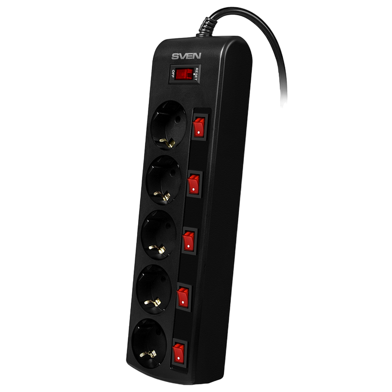 Surge Protector 5 Sockets, 1.8m, Sven "SF-05PL", BLACK, individual switches, flame-retardant