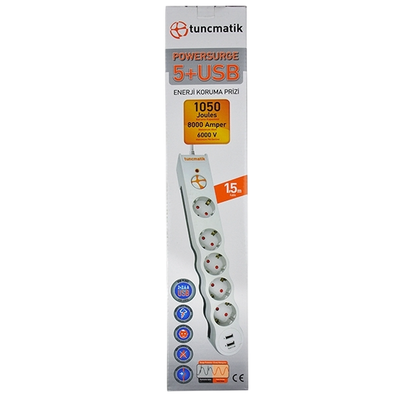 Surge Protector Tuncmatik Powersurge 5 Sockets + 2 USB LI 1050 J White 1,5 m