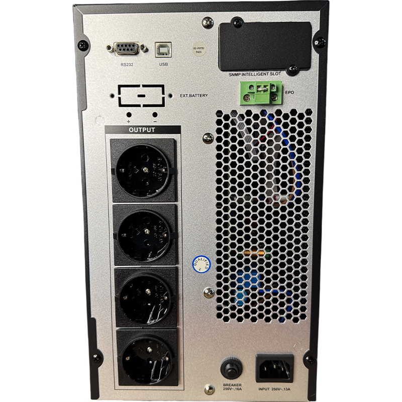 2KVA / 1800W Display: LCD Interface: RS-232, USB, SNMP Slot Battery: 6pcs 12V7.5AH Input voltage range: 220V: 115~300Vac Frequency: 220V: 40~60Hz, Adjustable by software Output voltage range: 220V: 220±2%Vac Wave form: Sine Wave Transfer time: 0 ms Overload capability: 110%~150% lasts for 30 seconds then transfer to bypass output, over 150% lasts for 300 milliseconds. Protections: 1. Auto re-starts when AC recovers 2. Silence setup 3. Automatic charging (offline charging) 4. Battery low voltage protection 5. Overload & Short circuit protection