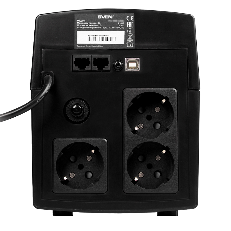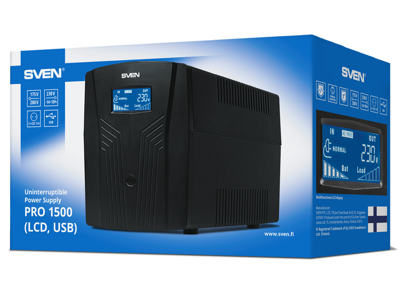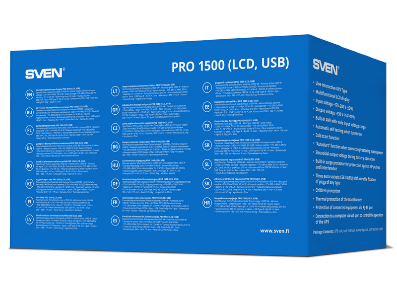 --- http://www.sven.fi/ru/catalog/ups/pro_1500.htm UPS type line-interactive Total power, VА 1500 Active power, W 900 Type of load computer, monitor Input voltage level, V 175 – 280 ± 3% Output voltage level, V ~220 ± 10 % Input frequency, Hz 50 Output frequency, Hz 50 ± 1 % (backup mode) Battery voltage, V 2 × 12 Battery capacity, А•h 2 × 9 Typical switching time, ms ≤ 10 Batteries operation time, min 3-20 (dependent on connected load) Environmental temperature, °С 0 – 40 Relative humidity, % 10 – 90 Efficiency, % > 70 Dimensions, mm 140 × 350 × 175 Weight, kg 10 Color black
